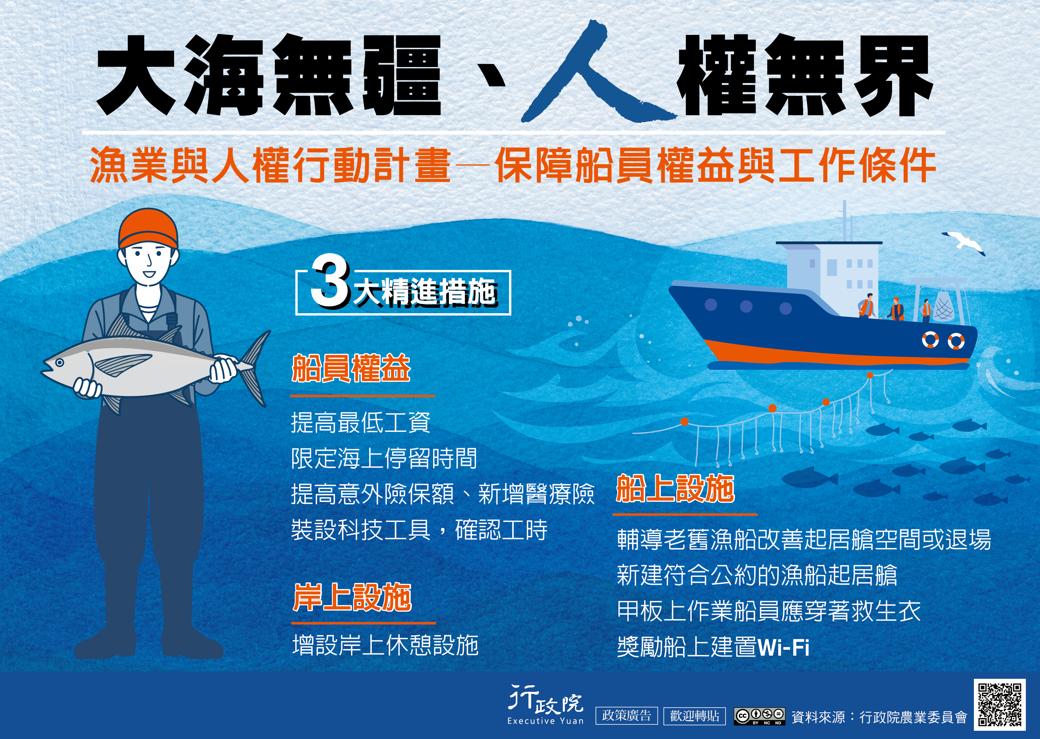 轉知行政院「漁業與人權行動計畫」政策說明資料,如附件。 為宣示我國對漁業人權的重視和態度,政府推動「漁業與人權行動計畫」,經由船員權益、船上設施及岸上設施等三方面著手改善,讓漁業工作者有個良好、安全及尊嚴的工作環境,確保外籍漁工權益,永續漁業經營。