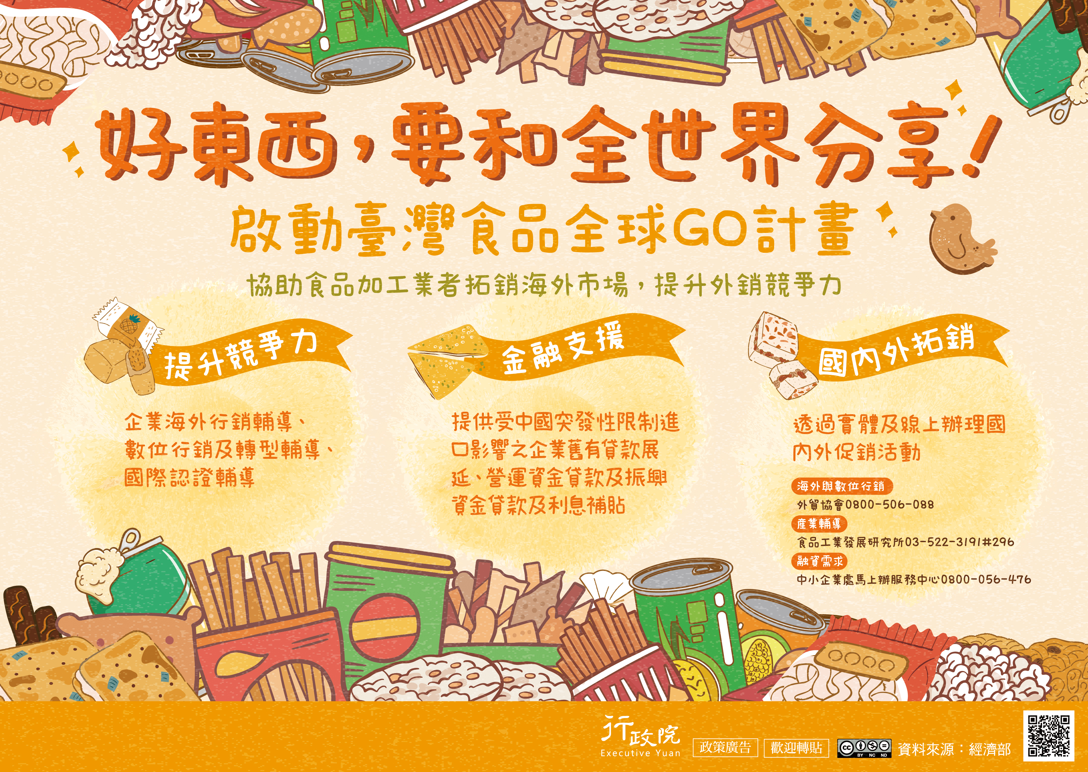 轉知行政院「臺灣食品全球GO計畫」政策說明資料,如附件。 為協助我國食品業者因應中國突然性限制出口之影響,政府啟動「臺灣食品全球GO計畫」,透過國內外拓銷、提升競爭力及金融支援,協助加工食品業者布建國際市場通路,分散出口市場。