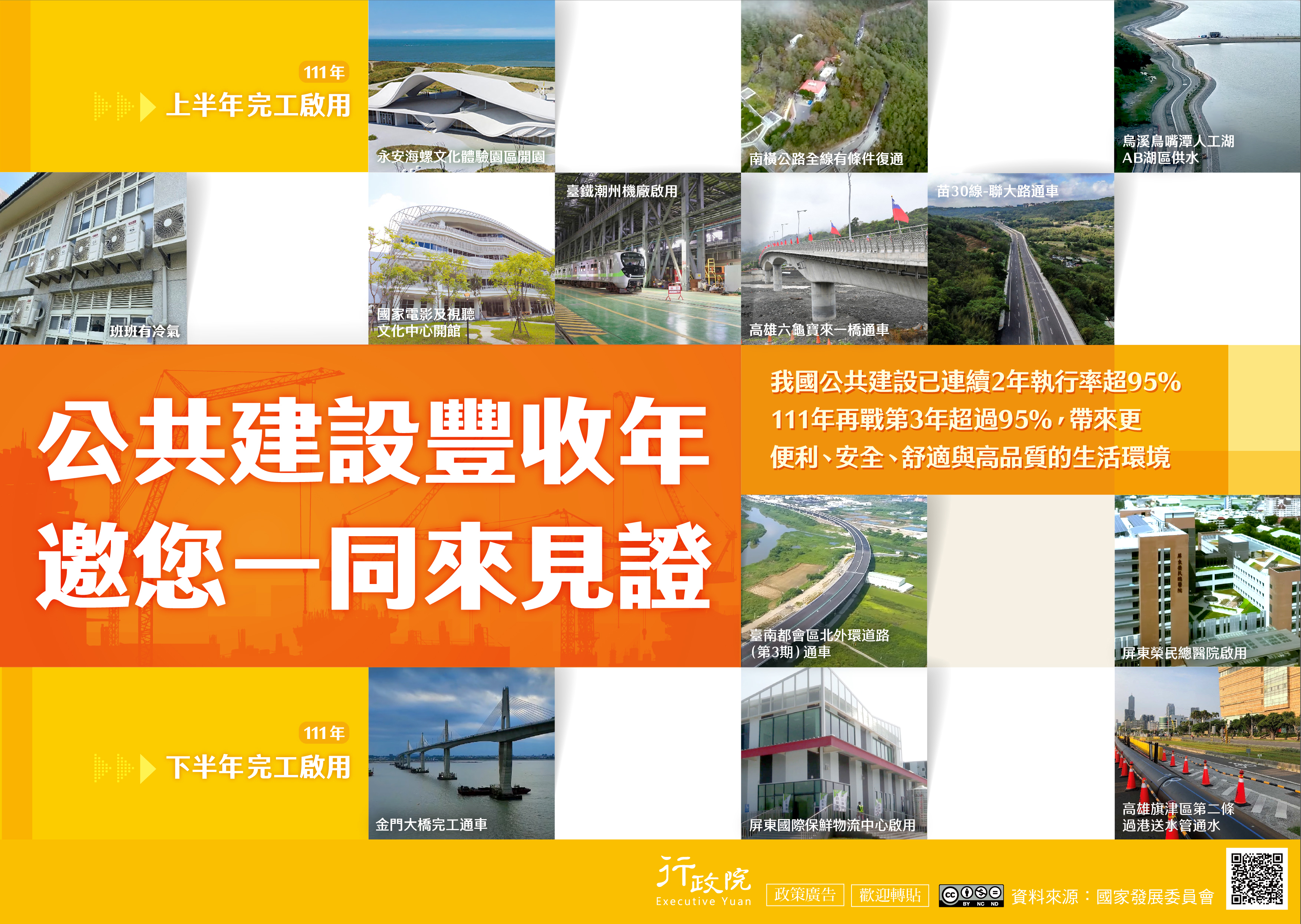 轉知行政院「111年公共建設計畫執行情形」政策說明資料,如附件。 我國公共建設已連續2年執行率超過95%,111年可望達成連續3年均超過95%的目標,為國人帶來更便利、安全、舒適與高品質的生活環境,並帶動內需與推升經濟發展。 「111年公共建設計畫執行情形」電子單張文宣(eDM)請多加推廣運用,電子檔請至行政院全球資訊網站(http://www.ey.gov.tw)下載(首頁/政策與計畫/政策櫥窗/ 111年公共建設計畫執行情形)。