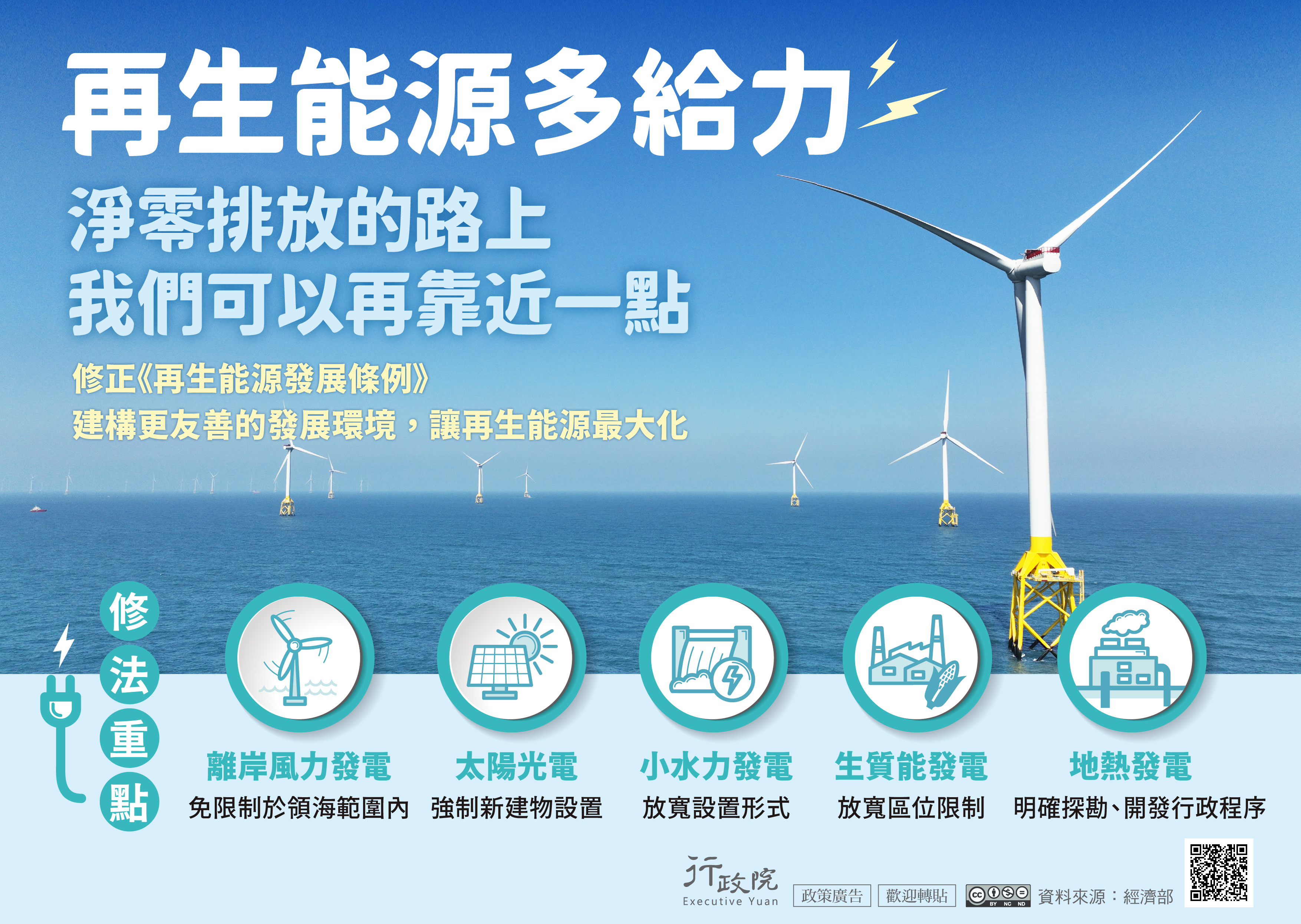 轉知行政院「修正《再生能源發展條例》」政策說明資料,如附件。 為完善我國再生能源發展環境,達成淨零排放目標,「再生能源發展條例」部分條文修正案,於本(112)年5月29日經立法院三讀通過。 「修正《再生能源發展條例》」電子單張文宣(eDM)請多加推廣運用,電子檔請至行政院全球資訊網站(http://www.ey.gov.tw)下載(首頁/政策與計畫/修正《再生能源發展條例》)。