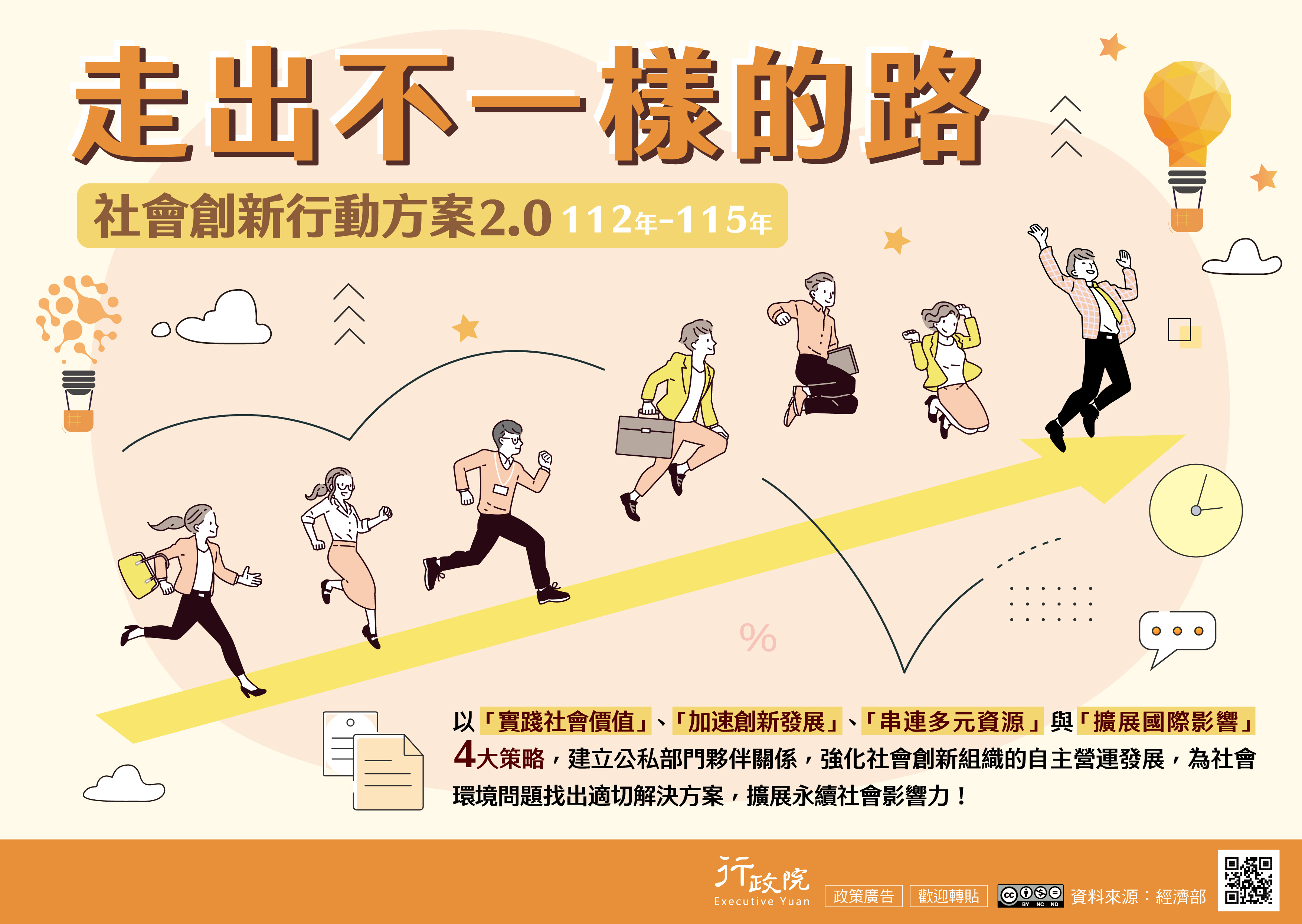 轉知行政院「社會創新行動方案2.0」政策說明資料,如附件。 為解決國家未來經濟、社會與環境問題,政府持續與民間合作,推動「社會創新行動方案2.0」,朝接軌聯合國永續發展目標邁進。。 「社會創新行動方案2.0」電子單張文宣(eDM)請多加推廣運用,電子檔請至行政院全球資訊網站(http://www.ey.gov.tw)下載(首頁/政策與計畫/政策櫥窗/社會創新行動方案2.0)。
