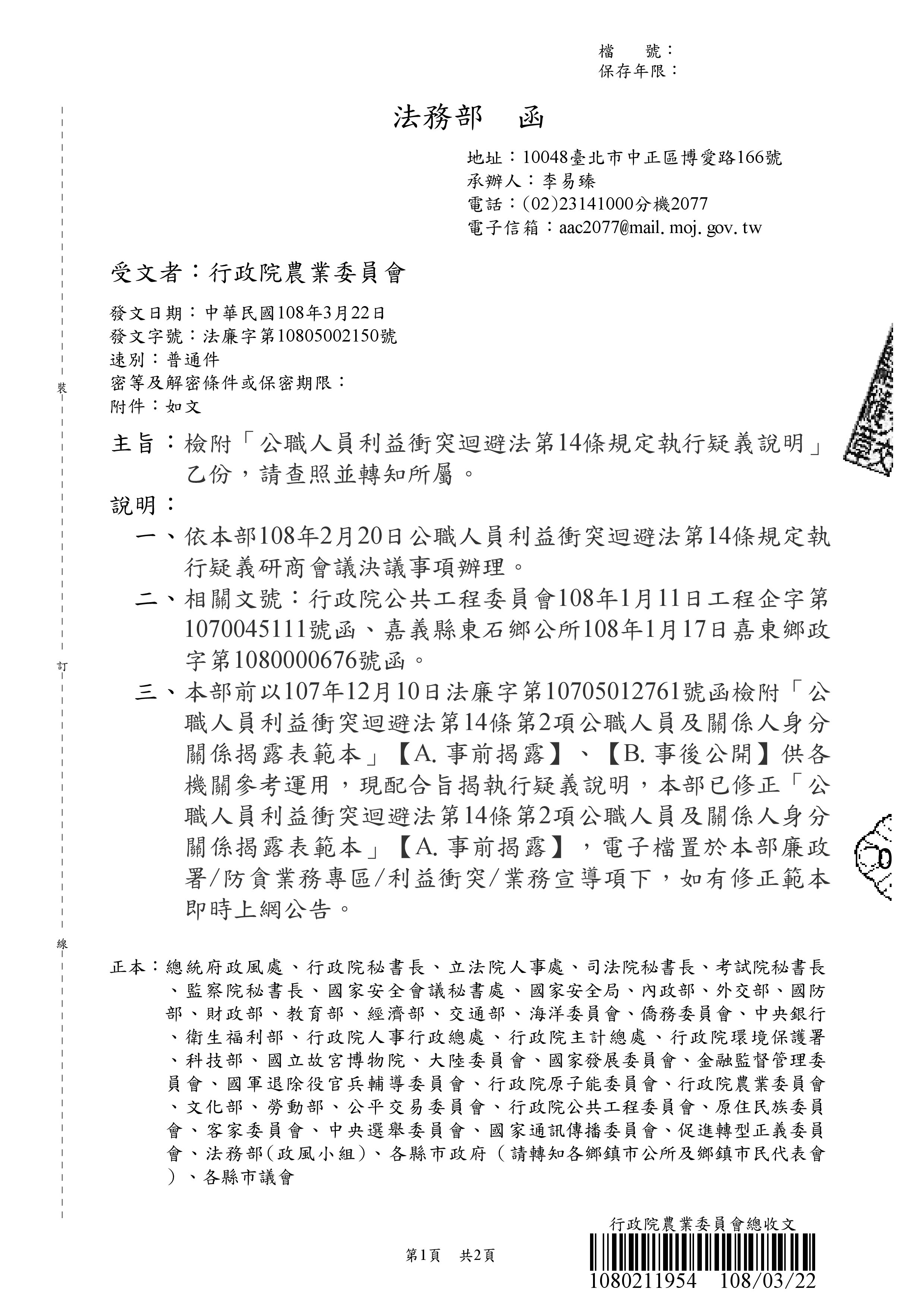 法務部函送「公職人員利益衝突迴避法第14條規定執行疑義」案