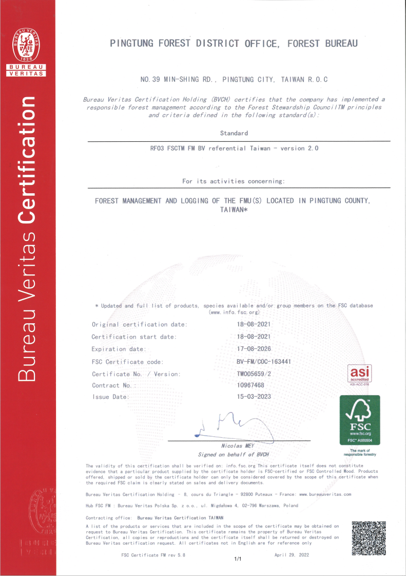 林業保育署屏東分署為推廣Forest Stewardship Council® (森林管理委員會)以獅子鄉枋山溪流域內面積8,695公頃的國有林依照FSC各項驗證標準要求與良好森林經營規劃,進行林木收穫、伐木跡地造林、銀合歡移除復育造林、林地巡護、環境及社會影響監測等森林經營作業,並與林地周邊機關、社區等權益相關方保持良好互動與溝通,以供給國內優良國產材、增加木材自給率、帶動林地周邊社區之經濟發展。於2021年8月通過FSC驗證,並透過持續的追蹤年度審核,以確保我們在各項森林作業能持續符合「永續森林經營目標」,以經濟可行、社會有利及環境適宜為目標,成為負責任國有林經營者的良好典範。