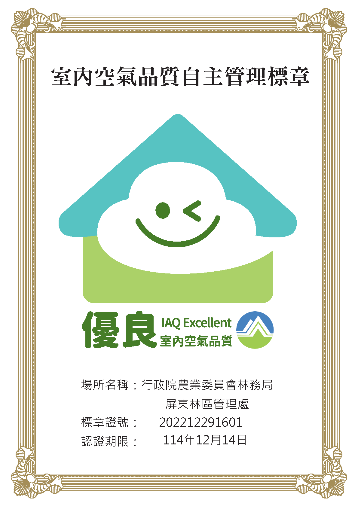 配合行政院環境保護署,倡導公私場所自主維護、持續改善場所之室內空氣品質,依據「室內空氣品質自主管理標章推動作業要點」,經第三方台灣檢測科技股份有限公司(SGS)檢測報告,獲環境保護署「室內空氣品質自主管理標章」 認證為「室內空氣品質優良」。