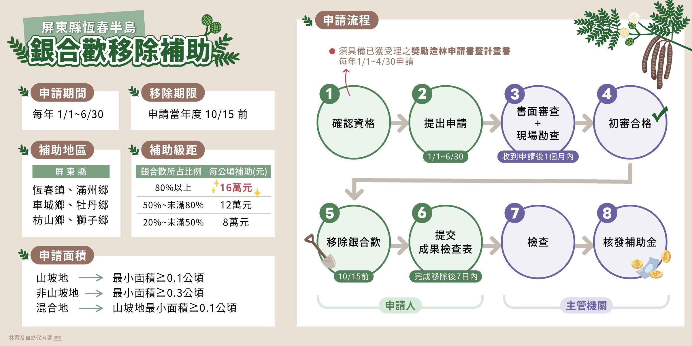 為鼓勵屏東縣恆春半島遭銀合歡強勢入侵土地之所有權人或合法使用人積極移除銀合歡,並配合獎勵造林政策進行造林復育,避免銀合歡重新萌發,農業部林業及自然保育署今發布施行「屏東縣恆春半島銀合歡移除補助作業要點」,依銀合歡入侵占比分級補助,期透過移除入侵植物接續造林復育,打造恆春半島永續生態環境。申請土地區域條件受理地區:屏東縣恆春鎮、滿州鄉、車城鄉、牡丹鄉、枋山鄉、獅子鄉。土地類型:私有土地、原住民保留地、國有土地出租之造林地、公有土地出租之造林地。土地區域符合「獎勵輔導造林辦法」第6條規定。山坡地:最小面積≧0.1公頃非山坡地:最小面積≧0.3公頃同時位於山坡地及非山坡地:山坡地最小面積≧0.1公頃銀合歡之覆蓋率或株數所占比例達20%以上。當年度已依「獎勵輔導造林辦法」規定申請獎勵造林獲受理,或同時提出申請。但於114年8月18日至12月31日間申請獎勵造林獲受理者,得於115年依本要點規定提出申請。(獎勵造林申請詳見https://www.forest.gov.tw/0005044)土地區域於112~113年未向本署屏東分署或屏東縣政府申請並領取銀合歡收購費用。註:114年8月17日以前申請核准之獎勵造林案件,依「獎勵輔導造林辦法」第32條規定,不論繼續辦理至20年獎勵期滿、申請變更為6年獎勵造林或終止造林,其土地區域均不適用本要點規定。移除補助級距銀合歡所占比例每公頃補助(元)80%以上16萬元50%~未滿80%12萬元20%~未滿50%8萬元申請期間每年1月1日至6月30日止。應備文件銀合歡移除補助申請書申請人之身分或登記、設立證明文件:自然人:國民身分證正反面影本私法人或非法人團體:登記或設立相關證明文件及代表人或管理人身分證明文件影本部落:中央原住民族主管機關核定文件影本最近3個月內土地登記謄本。但受理機關得以電腦完成查詢者,免附土地合法使用證明文件:土地為申請人單獨所有或申請人為各鄉(鎮)公所原住民保留地使用清冊記載有案之原住民或其繼承人:免附申請人非土地所有權人:他項權利證明書、租賃契約或其他足資證明所有權人同意之文件申請土地區域為共有土地:共有人之同意書或分管協議書;同意書應以共有人過半數及其應有部分合計過半數同意行之。但其應有部分合計逾2/3者,其人數不予計算申請人之國內金融機構存摺封面影本申請土地區域已獲受理之獎勵造林申請書暨計畫書影本受理機關及核准機關土地權屬受理機關核准機關本署經管之國有土地出租造林地申請土地區域所在地之本署屏東分署工作站本署屏東分署公有土地出租造林地、私有土地、原住民保留地申請土地區域所在地之屏東縣鄉(鎮)公所屏東縣政府移除期限申請人應於當年度10月15日前完成移除。註:115、116年申請之案件,因配合造林季節需要而有展延之必要者,申請人應於當年度9月30日前,向受理機關申請展延,最長得展延至次年4月30日。銀合歡移除補助流程