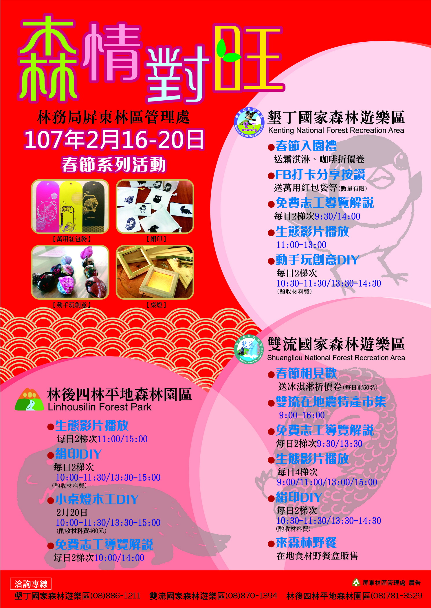 溫馨賀歲慶有餘,旺旺來福報新年,林務局屏東林區管理處轄屬墾丁、雙流國家森林遊樂區及林後四林平地森林園區,僅除夕(2月15日)當日休園1天外,春節期間初一至初五每日8時至17時服務不打烊照常營運,有好玩的DIY活動(動手玩創意、絹印、小桌燈木工)、園區導覽解說服務及生態系列影片播放等您來體驗,墾丁、雙流國家遊樂區同時提供入園或打卡小禮物,數量有限,送完為止,歡迎愛好山林的朋友閤家蒞臨前來享受森林芬多精的洗禮。 春節連假是闔家團聚走春最佳時機,為增添春節期間旅遊樂趣,屏東林區管理處轄屬墾丁、雙流國家森林遊樂區及林後四林平地森林園區每日有2場次「免費園區導覽解說服務」,由國家森林志工帶領大家更深入瞭解園區景觀、歷史等特色,各園區每日還有2場次之DIY活動(酌收材料費),採現場報名數量有限,歡迎大家踴躍參與。 春節期間墾丁國家森林遊樂區入園遊客均贈送霜淇淋、咖啡折價券,另於FB打卡分享按讚可獲得小禮物;雙流國家森林遊樂區每日前50名入園遊客均贈送冰淇淋折價卷,同時還有雙流在地農特產市集;林後四林平地森林園區提供單車租借服務,備有成人車、親子車及兒童車,歡迎騎乘體驗。活動詳情可逕自參閱屏東林區管理處網站http://pingtung.forest.gov.tw/或墾丁國家森林遊樂區粉絲專頁https://www.facebook.com/ktforestarea/或雙流國家森林遊樂區粉絲專頁https://www.facebook.com/shuangliou.forest/及林後四林平地森林園區粉絲專頁https://zh-tw.facebook.com/linhousihlin。 【旅遊資訊及專線】 屏東林管處處長張偉顗再次籲請大家注意,藤枝國家森林遊樂區目前仍休園,遊客請勿上山。墾丁、雙流國家森林遊樂區及林後四林平地森林園區全面禁止攜帶寵物入園及禁止吸煙。 春節期間服務專線: 墾丁國家森林遊樂區(08)886-1211 雙流國家森林遊樂區(08)870-1394 林後四林平地森林園區(08)781-3529