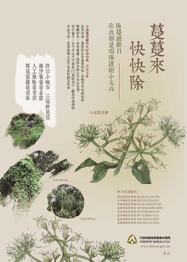 俗稱「綠癌」的小花蔓澤蘭為外來入侵植物,會危害本土森林生態系,每年10月開花期前,是移除的好時機,屏東林管處六龜工作站為防治小花蔓澤蘭,預計在9月7日(週六)當天上午9點半,於十八羅漢山服務區舉辦「蔓蔓來,快快除」入侵植物防治及宣導活動,邀請民眾參加。 當天還特別安排解說員帶領大家一起走訪附近溪谷,尋找小花蔓澤蘭、香澤蘭、刺軸含羞木等入侵植物,共同動手移除,活動結束後,於服務區發放宣導品及小樹苗共80株,相信前來參與的民眾都能透過活動瞭解環境保育的重要,並在親自保護樹木後獲得滿滿成就感。 還在猶豫嗎?快來六龜十八羅漢山!一起動動手、剷除蔓澤蘭,還給森林美好環境。