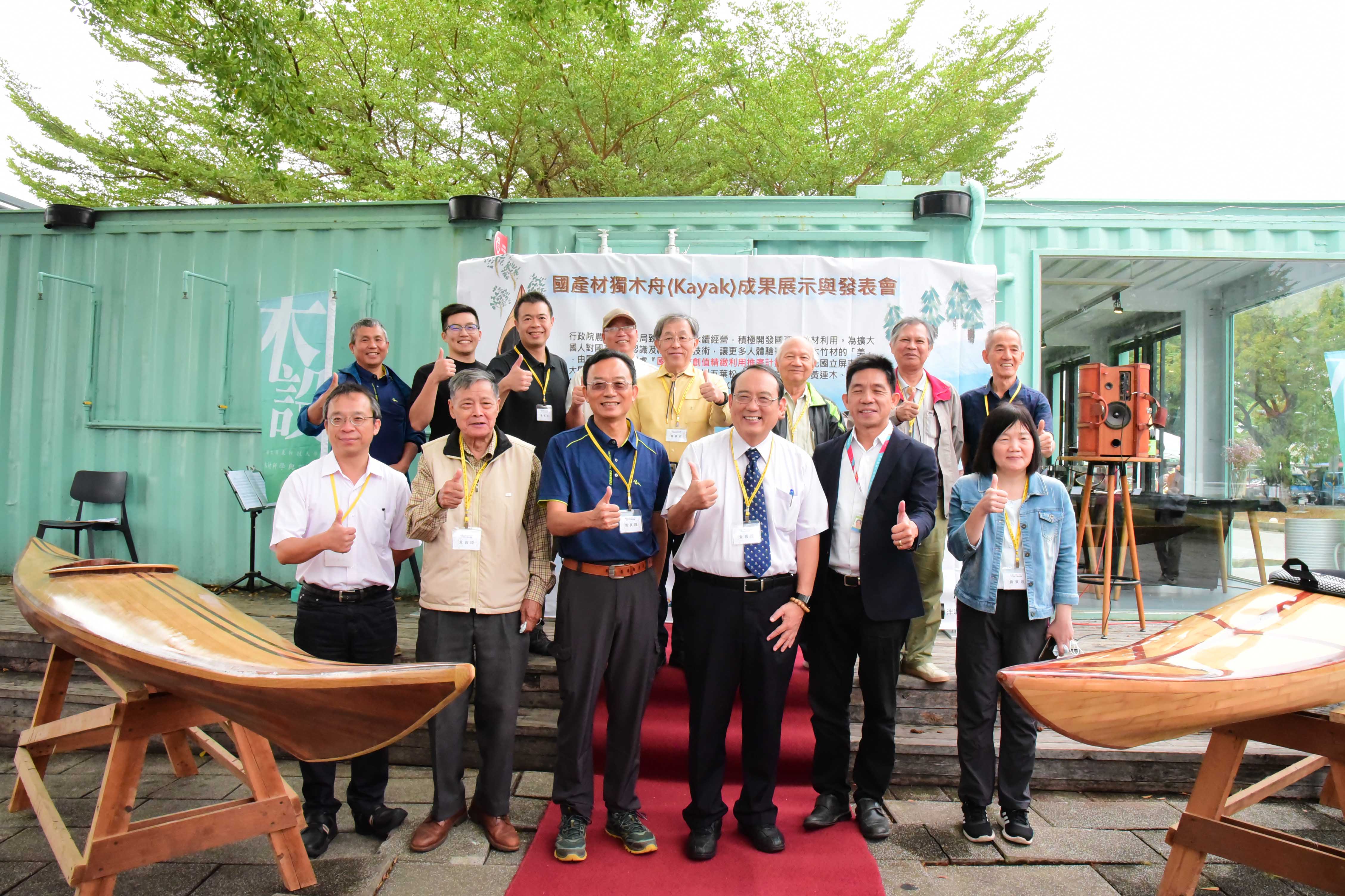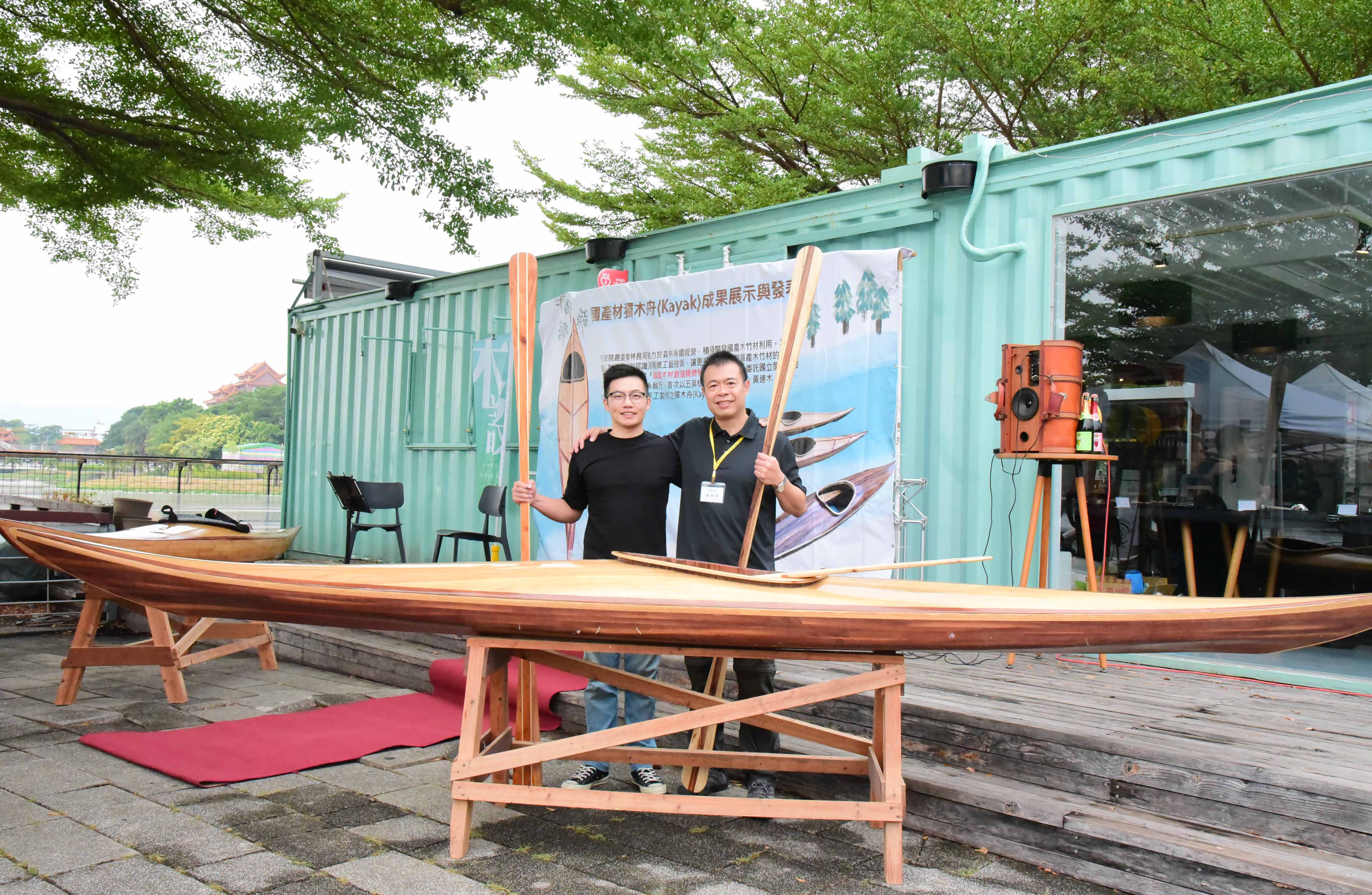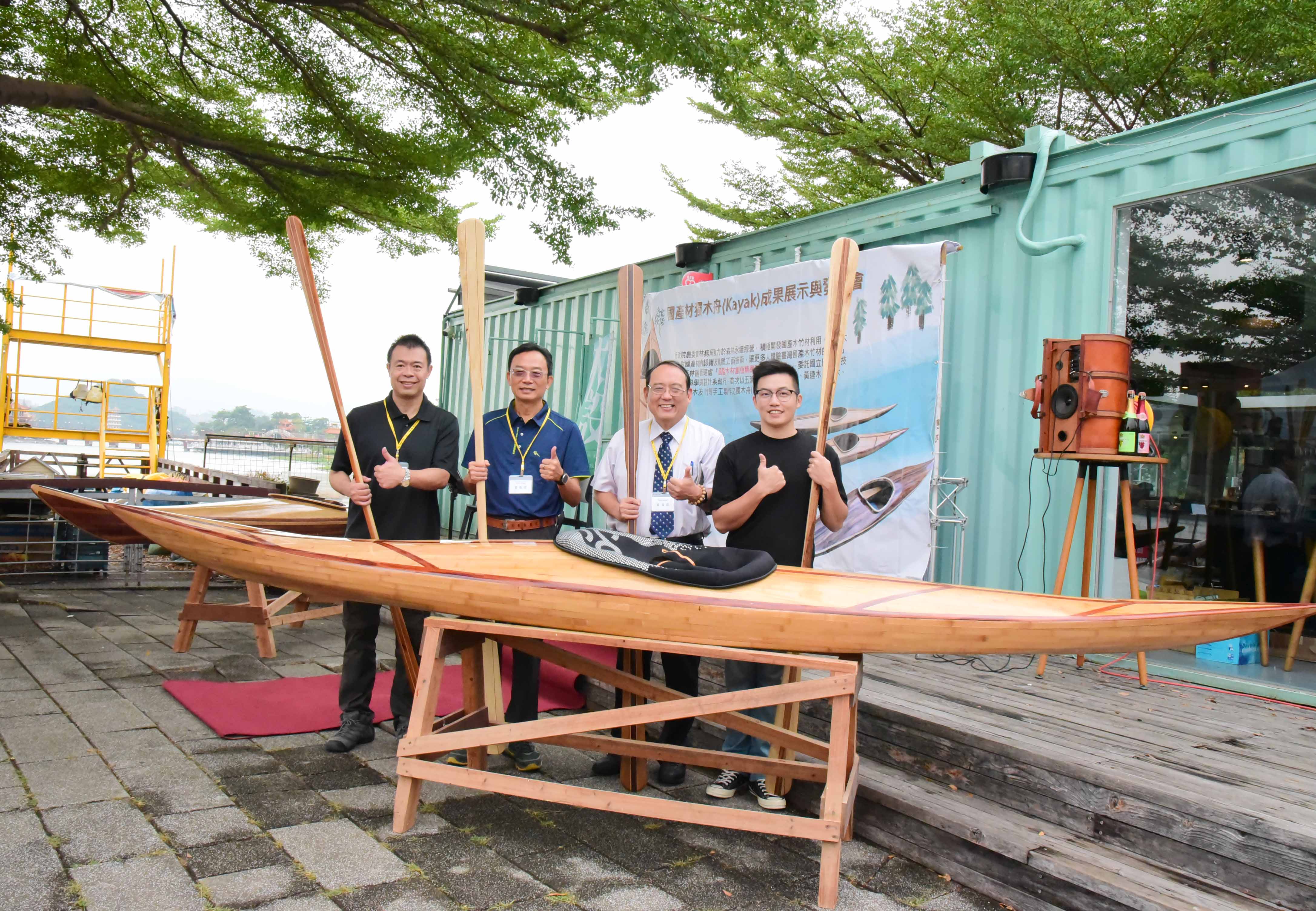 林務局屏東林區管理處與屏科大木設系合作「國產木材創值精緻利用推廣計畫」,致力於森林永續經營與木竹產業發展,積極推廣國產優質木材的多元利用,以及擴大國人對國產木竹材自然美之體驗與認識。首次以五葉松、櫸木、烏心石、黃連木、樟木、牛樟、相思木及竹等手工製作之獨木舟(Kayak),研發出在地化、精緻、高質之國產木材作品。屏科大木設系龍暐助理教授帶領系上碩士班研究生余浤銓經歷一年半的研究發展,利用木材特性,透過精緻、細緻、機制具備的特色下設計出國產木竹材質獨木舟,今日(10/23)在高雄蓮池潭舉行國產材獨木舟成果展示與發表會,讓民眾能更深入了解國產材如何以最精緻的手法創作出高品質的產品,同時也能更加熟悉台灣自產的木材特色。 屏東林區管理處張偉顗處長表示:「林務局推廣國產材應用,提供國內木材市場需求同時加強木材生產自給率,獨木舟製作不僅為南台灣活力象徵,永續性經營生產的國產材料更是具環境面、經濟面與社會面等意義,藉由國產材的紋理、色調選材設計出獨一無二、輕量強化之複合產品,完美融合美學與科學的水上工藝品。期望未來能持續結合產官學各界一同推廣國產材的精緻工藝技術與發展。」屏科大戴昌賢校長說:「屏科大致力推動跨領域特色課程,在獨木舟的設計製造上,不只有木設系、同時還需要加入森林系、休運系,同時也需要導入工程方面的專業人才,以流體力學概念,設計出最適合在海上破浪的舟體,未來更希望能透過校內跨系合作,不斷實驗、精進,朝向客製化休閒運動的器材開發,打量國人精準健康的優質生活。」 本次設計製作的獨木舟從國產材收集、製材乾燥、備製、設計配置、工法選擇與測試完工等繁複工序,皆由木設系余浤銓同學獨立製作三艘舟體,依木材樹種特質、木紋理、色調表現、不同拼板工序對次組合,設計出具美學品質、獨一無二的個性化圖案。加上曲面幾何加工、輕量強化複合技術,設計出流線型的船身達到最佳巡航控制性。完美融合美學以及科學的水上工藝品。期望能推廣國產材的精緻工藝技術與發展,有助於幫助台灣林業和森林保育邁向永續發展。 而隨著社會與經濟的成長,國人的生活品質從理性的滿足,提升至追求精神與心靈的層面。因此,人們為陶冶性情與抒發情感,而往往選擇利用戶外休閒體驗來增添生活中的樂趣。這次的展示活動邀水上活動專家進行划船示範,藉此結合台灣目前推廣國人的水上戶外活動。也期盼能讓人有獨處在台灣宏偉森林之中,優游於台灣寧靜水域的感覺,可謂山、水、人的結合體驗。