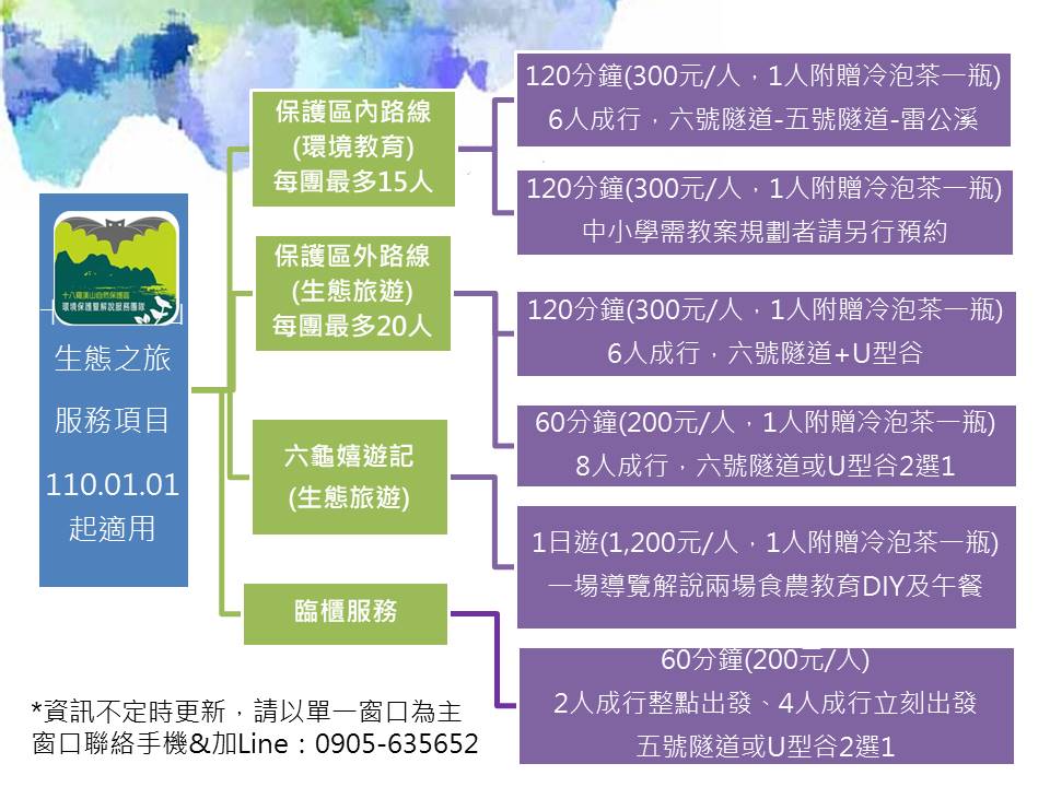 自110年1月起,申請十八羅漢山遊程開始以人頭計算,不用再以團客方式報名囉! 「十八羅漢山自然保護區環境保護暨解說服務團隊」自106年成立以來,原解說路線及收費方式以15-20人為單位預約解說員,經持續檢討解說員人事成本、各種解說備品的需求,及因應國內旅遊升溫,小眾旅遊需求增加的情況下,制定了新的解說方案,平日事前預約6人即可成行,原則每週六的臨櫃服務改為2人成行整點出發或4人以上立刻出發,方案如下: 事前申請:300元/2小時/1人,6人成行,每團15人為上限,並1人附贈冷泡茶1瓶。 臨櫃服務(原則每週六及國定假日):200元/1小時/1人,2人成行整點出發或4人以上隨時出發。 在屏東林區管理處、交通部觀光局茂林國家風景區管理處、國立屏東科技大學及在地協會等單位輔導下,十八羅漢山解說服務團隊於109年成立為「高雄市六龜區十八羅漢山自然人文協會」,這是一個新里程,作為國內第一個社區參與保護區經營的協會組織,其目標與承諾是永續發展,結合平時各自忙碌著的一群六龜居民,以維護自然保護區的環境、生物多樣性為初衷,每週進行三次的保護區巡護監測,以實際且無償的行動保護環境與動植物生態、預防盜採盜伐及環境整理維護,協會收入的20%也用於社區回饋。 十八羅漢山自然保護區具有礫岩層、動植物、採樟人文歷史特色,如今由在地居民組成協會,成為全台灣第一個可受理預約解說導覽的保護區,透過解說服務也可支持六龜的在地就業,若想更了解各遊程方案,可至「十八羅漢山生態之旅」FB粉絲團查詢,或撥打0905-635-652專線洽詢。 十八羅漢山生態之旅FB粉絲團https://goo.gl/SgeWjf