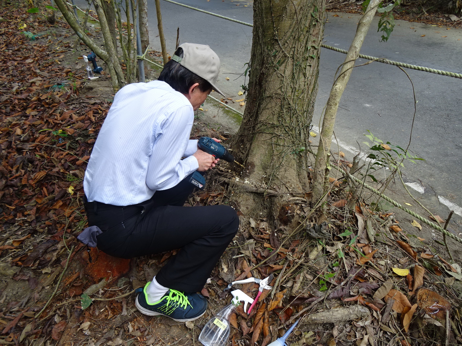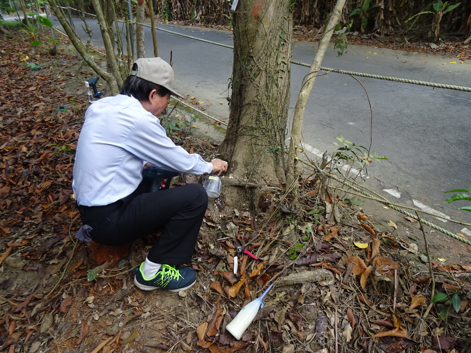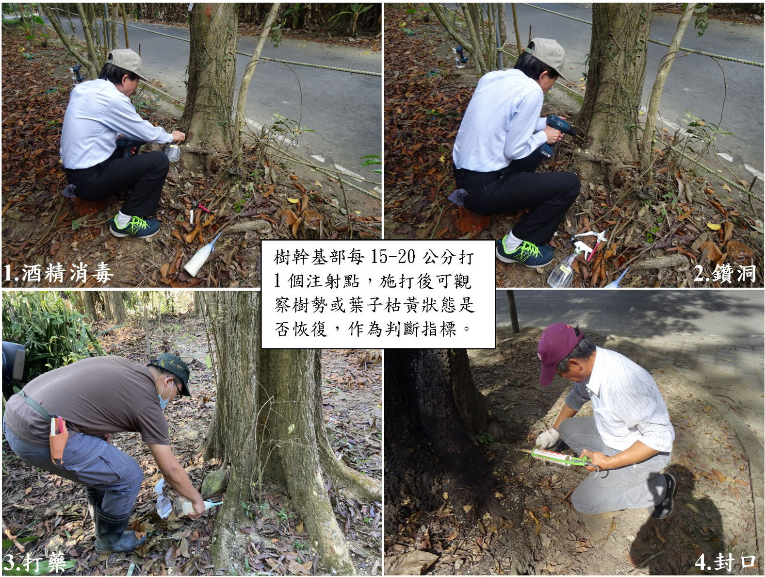 已移除之病株計有如吉貝木棉、垂葉榕、火焰木等34株;另邀請台大孫岩章教授針對感染輕微樹木計44株注射藥劑防治。孫教授所試驗研發的褐根腐病藥劑,已在去(109)年臺灣植物醫學期刊正式發表,藥劑包含殺菌劑、營養劑等多種成分配製而成,藥劑施打後留存在樹體內,對環境不會有影響,符合友善環境原則。