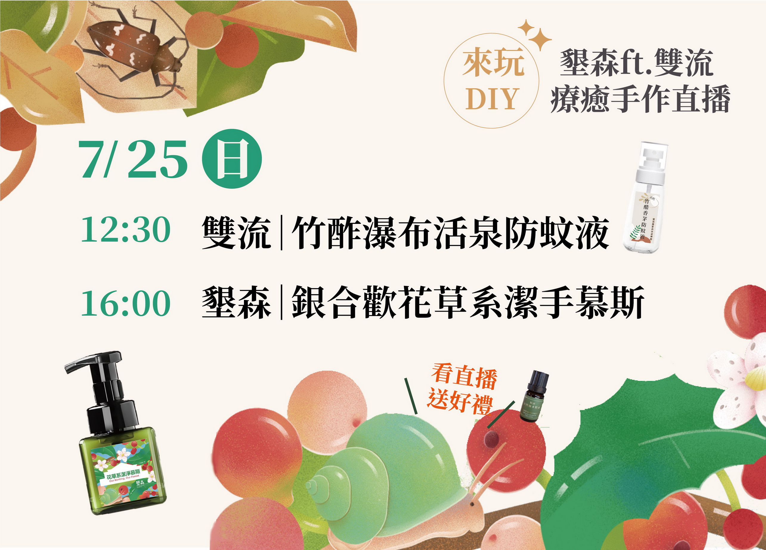 走進山林是疫情期間許多人悶在家裡2個月後最懷念的戶外活動,在疫情降級微解封前最後一個周日,屏東林區管理處特別企劃於7月25日(星期日) 12時30分推出「竹醋香茅防蚊液」、「銀合歡花草系潔手慕斯」森林療癒手作直播教學,邀請民眾最後一週假日在家防疫不鬆懈外,也能在家享受森林美景,並藉以透過森林療癒主題DIY教學瞭解非木質國產材之生活運用。 森林療癒手作直播活動將於本周日(7/25) 12時30分登場,先在美麗飛瀑與豐富負離子環繞的雙流國家森林遊樂區粉絲專頁(https://www.facebook.com/shuangliou.forest/)進行首場開播,課程將以雙流天然瀑布活泉水與國產孟宗竹蒸餾竹醋液,添加香茅精油與茶樹純露,製作森友們戶外走跳必備「竹醋香茅防蚊液」;下午4時第二場由墾丁國家森林遊樂區粉絲專頁(https://www.facebook.com/ktforestarea/)接棒,結合銀合歡原精、薰衣草純露、甜橙精油製作「銀合歡花草系潔手慕斯」,在全民共同努力防疫時期,更溫暖呵護手部清潔與保養,同時藉由森林療癒直播,讓大家在假日午後不出門也能感受到森林及瀑布野趣。 現至雙流國家森林遊樂區及墾丁國家森林遊樂區FB官方粉絲按讚,並於直播前至置頂直播預告貼文完成留言分享,首播中就會抽出幸運森友贈送台灣國產認證檜木精油乙瓶;週日也請準時鎖定2場森林療癒手作直播,直播期間互動留言也將加碼贈送「竹醋香茅防蚊液」或「銀合歡花草系潔手慕斯」手作成品喔!詳細活動辦法與直播連結請至雙流國家森林遊樂區FB粉絲頁(https://www.facebook.com/shuangliou.forest/)、墾丁國家森林遊樂區FB粉絲頁(https://www.facebook.com/ktforestarea/)或屏東林區管理處FB粉絲專頁(https://www.facebook.com/pingtung.forest.gov.tw/)查詢。