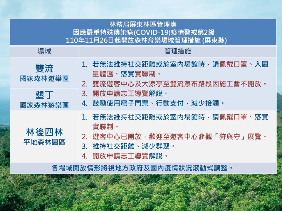屏東林區管理處配合中央流行疫情指揮中心循序漸進調整相關戶外活動及公共場域人流控管措施,自11月26日起,本處所屬檜谷山屋及周邊營地,恢復原有開放住宿量。 屏東林區管理處提醒民眾,依據中央流行疫情指揮中心發布指引,目前遊客於國家森林遊樂區與自然步道空曠地點可不佩戴口罩,惟若無法維持安全社交距離時,或於室內場館、山屋室內空間及營帳內有非同住親友者,仍應全程佩戴口罩。 另外,倘屬指揮中心公告之居家隔離、居家檢疫及自主健康管理之人員,以及上山隊伍成員若有發燒、呼吸道不適或嚴重咳嗽者等症狀,應避免申請上山及入住山屋;入住人員應於戶外通風處、室內指定地點或各自營帳內用餐,落實登山安全與防疫風險自主管理。 近期寒流來襲天氣變化較大,請民眾上山親近山林前,記得提前做好登山規劃及裝備整備。進入山林後也請民眾一起遵守無痕山林原則,守護美好的山林。 屏東林區管理處各森林育樂場域開放情形,會視國內疫情狀況與地方政府最新發布之管制公告內容滾動式調整,籲請民眾出發前務必至台灣山林悠遊網(https://recreation.forest.gov.tw/)查詢場域最新開放情形。