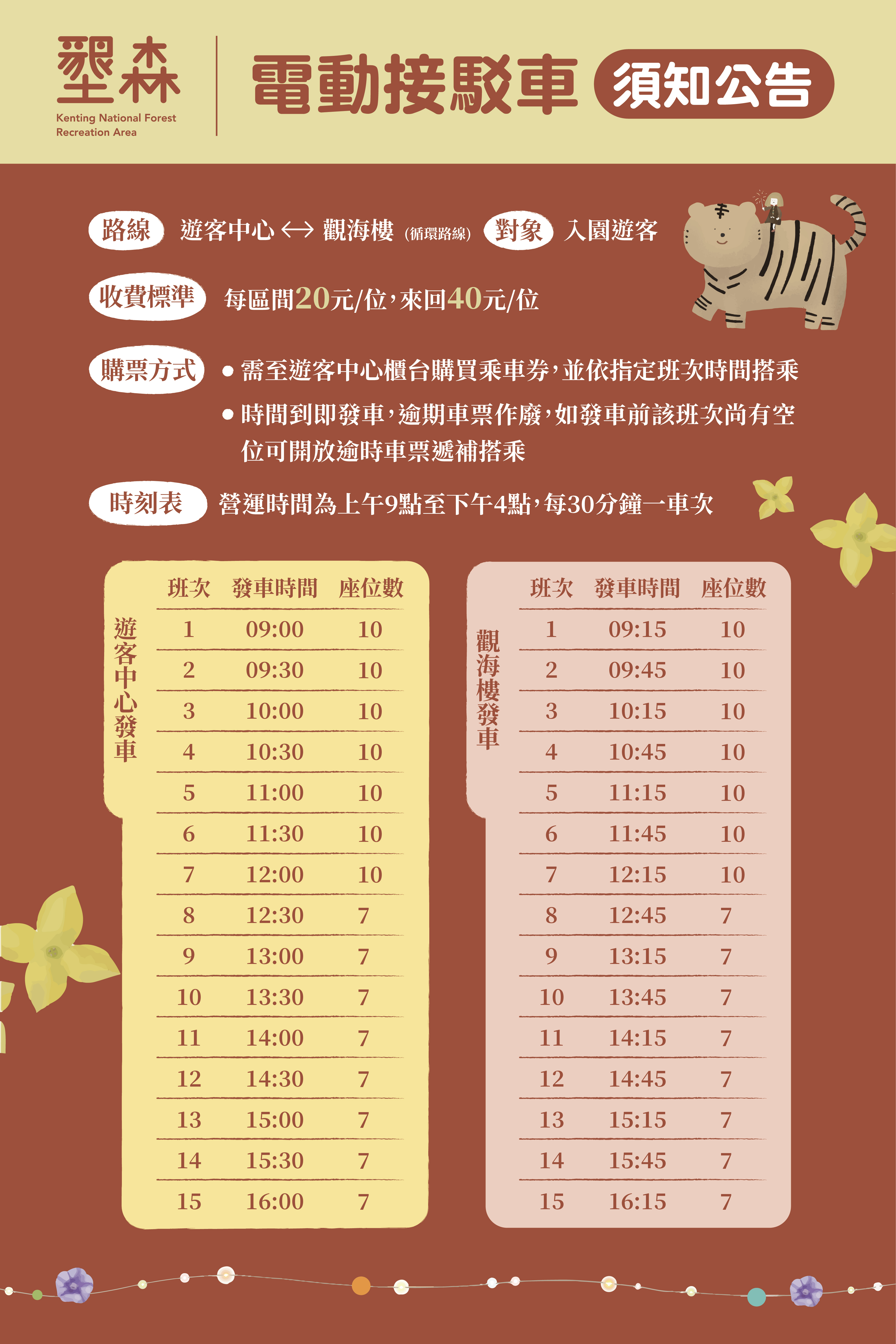 林務局屏東林區管理處為了提供遊客更優質的遊憩選擇,在春節期間(2月1日-2月6日)推出墾丁國家森林遊樂區付費接駁服務,銅板價就能享受不同的森林體驗。 考量墾丁國家森林遊樂區範圍廣大,由入口進入後經遊客中心到觀海樓廣場,全長約2公里,遊客來回需2-3小時。為了讓遊客能更輕鬆舒適走訪園區內更多的景點,屏東林區管理處特別選在農曆春節期間讓電動接駁車加入服務遊客的行列,相關電動接駁車資訊請追蹤墾丁國家森林遊樂區粉絲專頁(https://www.facebook.com/ktforestarea)。 為了搭配園區步道寬度及遊客步行的舒適度,墾丁國家森林遊樂區春節期間共有3台5-7人座電動接駁車投入服務量能,行駛的路線由遊客中心為起點,終點則為觀海樓廣場,逛園區不用怕走到腳軟,歡迎春節期間至墾丁國家森林遊樂區的民眾多加利用。 遊客搭乘電動解說遊園車資訊: 1.行駛路線: 遊客中心(搭乘等候處)-觀海樓廣場(回程等候處)。 2.搭乘時間:上午9點至下午4點,每半小時1班次。 3.收費標準:單趟20元/位,來回40元/位。 4.購票方式:至遊客中心櫃台購買乘車券,並依指定班次時間搭乘,時間到即發車,逾期車票作廢,如發車前該班次尚有空位可開放逾時車票遞補搭乘。