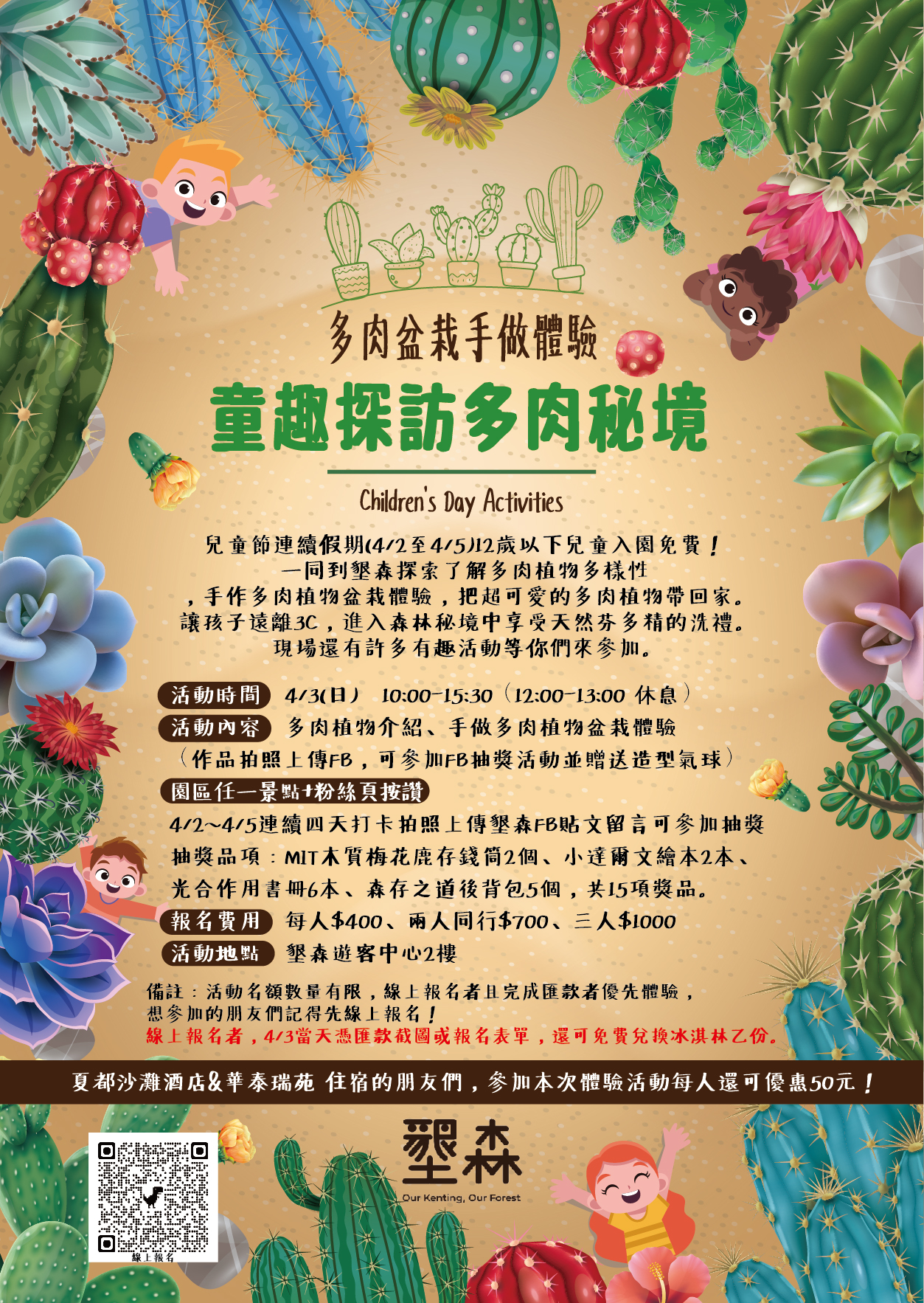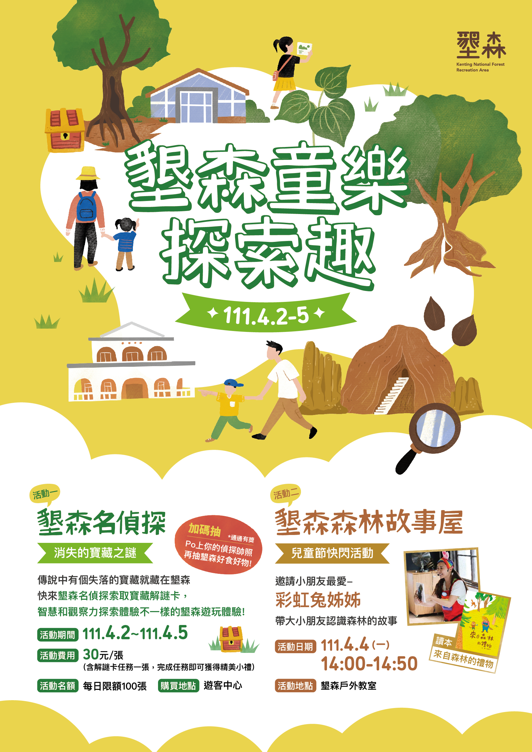 還在煩惱四月連假該怎麼安排活動嗎?墾丁國家森林遊樂區為歡慶兒童節特別在4月2日(六)至4月5日(二)期間推出「墾森名偵探–消失的寶藏之謎」及「童趣探訪多肉秘境」親子特別活動企劃,邀請親子共同到墾森尋寶,用智慧和觀察力探索體驗不一樣的墾森面貌。 「墾森名偵探–消失的寶藏之謎」活動於4月2日(六)至4月5日(二)期間舉辦,可在墾森遊客中心購買尋寶任務卡(每張販售30元),解出任務卡上的6道關卡,完成任務就可獲得精美小禮及好禮抽獎,每日限額100名。 「童趣探訪多肉秘境」中的手作DIY活動在4月3日(日)10:00-15:30,大小朋友歡迎到遊客中心二樓體驗,親手搭配出專屬的多肉盆栽(每人報名費400元),揪團參加還可以享報名優惠喔!另外,到仙人掌溫室打卡拍照上傳墾森粉絲專頁,還有機會抽中專屬紀念品,歡迎大小朋友,一起手植綠意繽紛。 「墾森森林故事屋」活動於4月4日(一)14:00在墾森戶外教室辦理,在林蔭微風下,讓說故事姊姊以生動有趣說故事方式帶大家認識台灣的森林與山林間的小動物,同時培養孩子們關心生態保育的重要性。因座位數量有限,有興趣的民眾當日可盡早入座。 詳細活動內容資訊請見「墾丁國家森林遊樂區」FB粉絲專頁(網址:https://www.facebook.com/ktforestarea)。此外,屏東林區管理處鼓勵親子同遊體驗大自然, 12歲以下兒童在4月2日至4月5日連假期間,憑證明文件可免費進入墾丁國家森林遊樂區,邀請大家一同到墾森同樂探索趣。