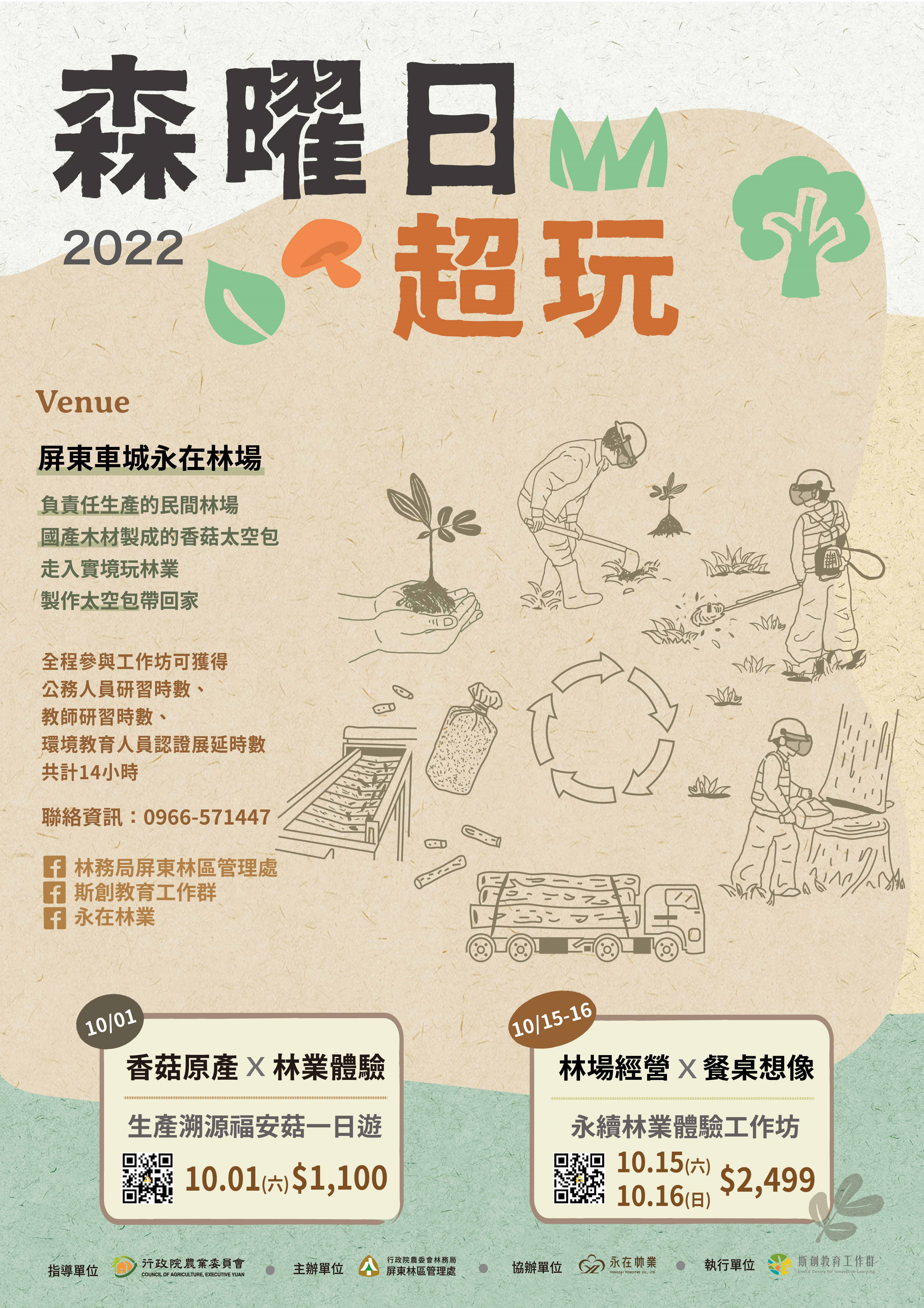 林務局屏東林區管理處為推廣負責任的森林經營模式及國產材利用,於屏東車城永在林場辦理一日遊及兩日型工作坊的「森曜日超玩」系列活動,10月1日推出「香菇原產×林業體驗-生產溯源福安菇一日遊」,10月15-16日則是「林場經營×餐桌想像-永續林業體驗工作坊」,活動將由林場經營達人帶您走入林場,一窺林業作業現場的經營實務,還可將國際驗證太空包帶回家喔!邀請對林業實務經營、林場作業體驗、國際森林驗證有興趣的民眾一同來玩林業,二場活動是今年度的最後兩梯次,千萬別再錯過囉! 屏東林區管理處表示,為了讓平日不易接觸林業工作的民眾理解林業如何經營才能獲得國際認可,從去年起陸續辦理6場次的森曜日超玩系列活動,獲得參與民眾與學員的熱烈好評,藉由實地親身至林場體驗與操作,逐步改變參與民眾對生產性人工林經營之觀念與價值觀,認同以負責任經營的精神來經營森林,促進林場之遊憩價值與體驗經濟,增進一般民眾對國產木材使用的理解與支持。 森曜日超玩系列活動,每場次開放24位名額,報名採線上報名方式,將於8月15日上午10點起開放報名(視簽准日期調整),相關報名資訊請詳見「林務局屏東林區管理處臉書粉絲專頁」查詢。