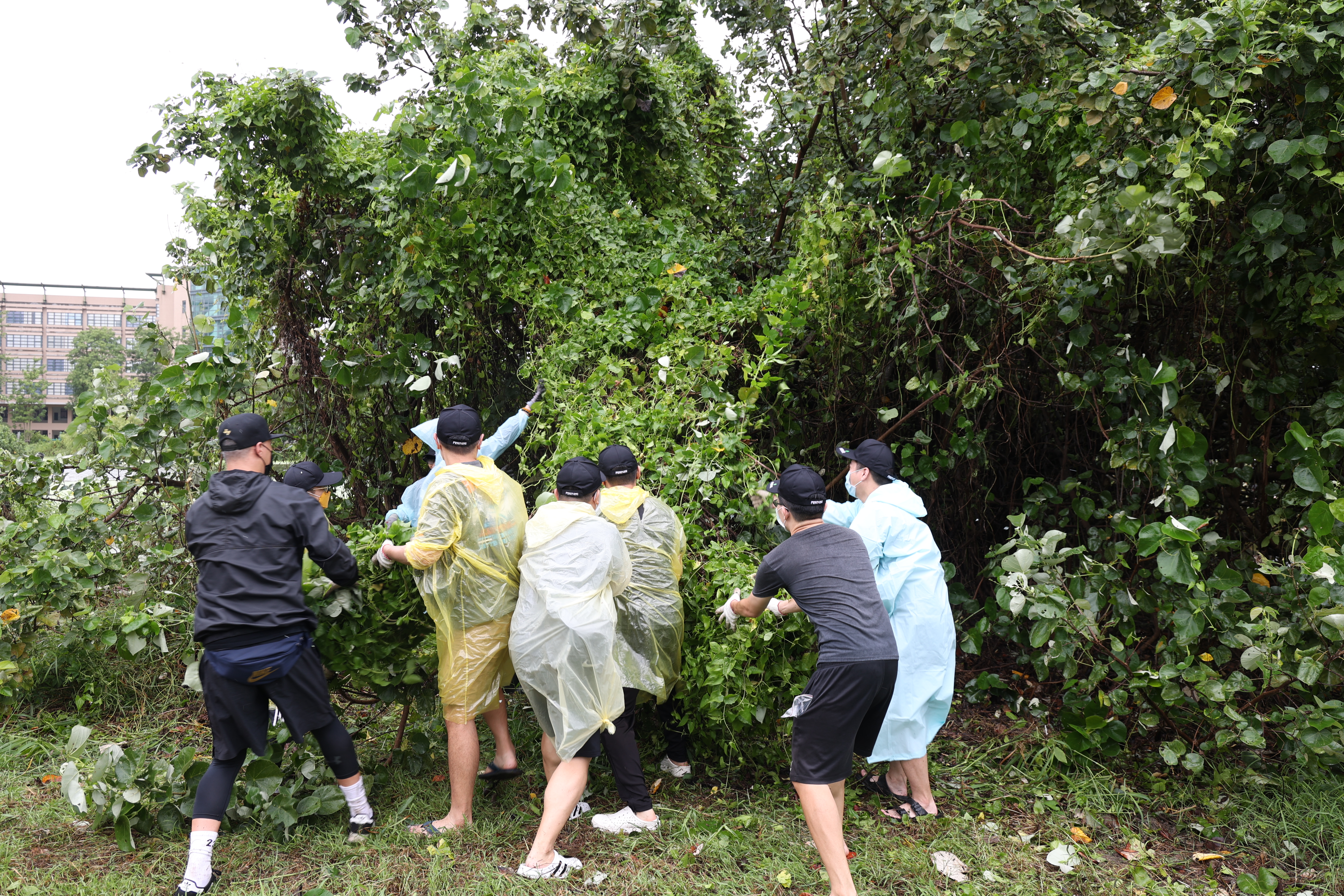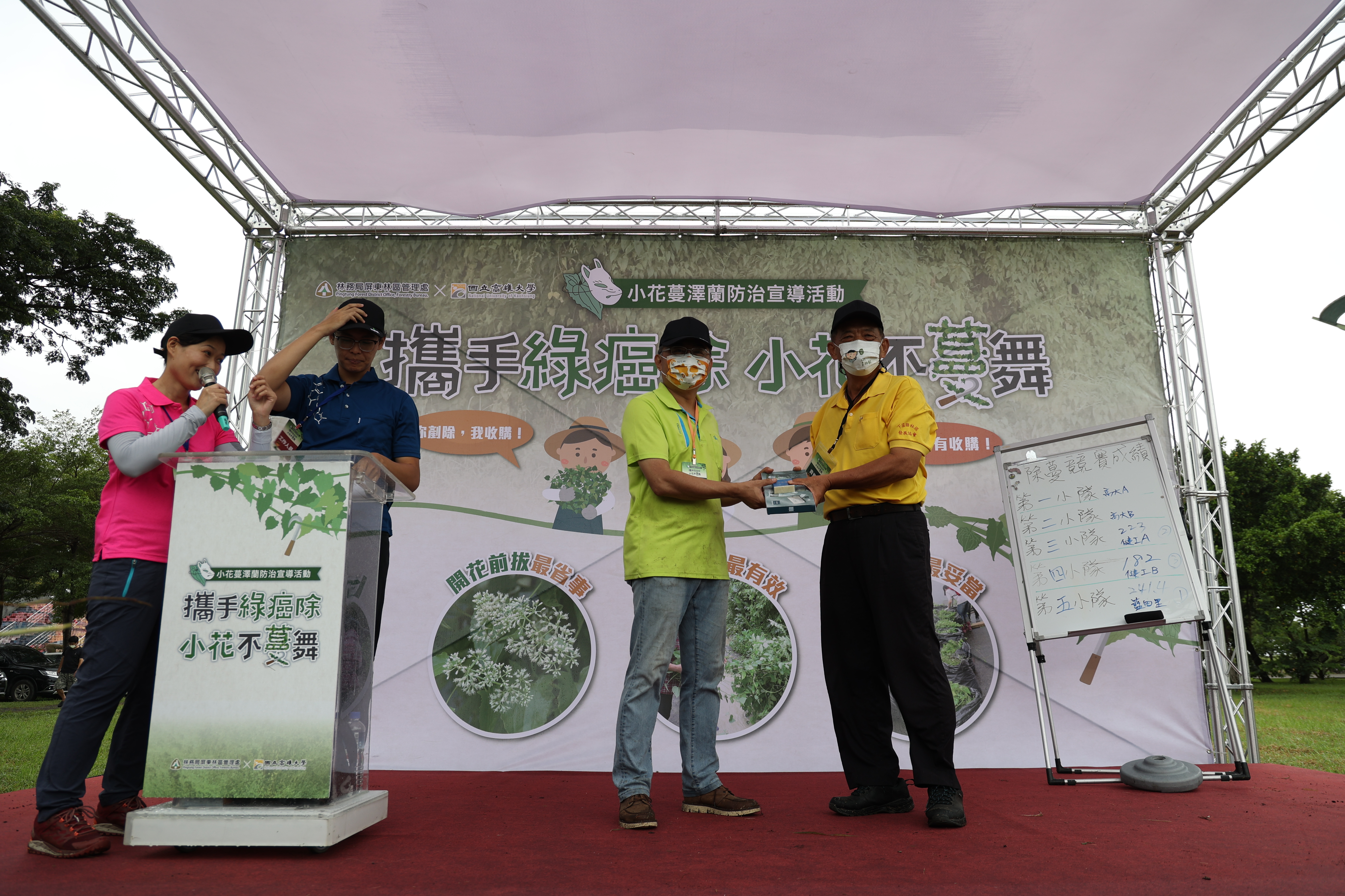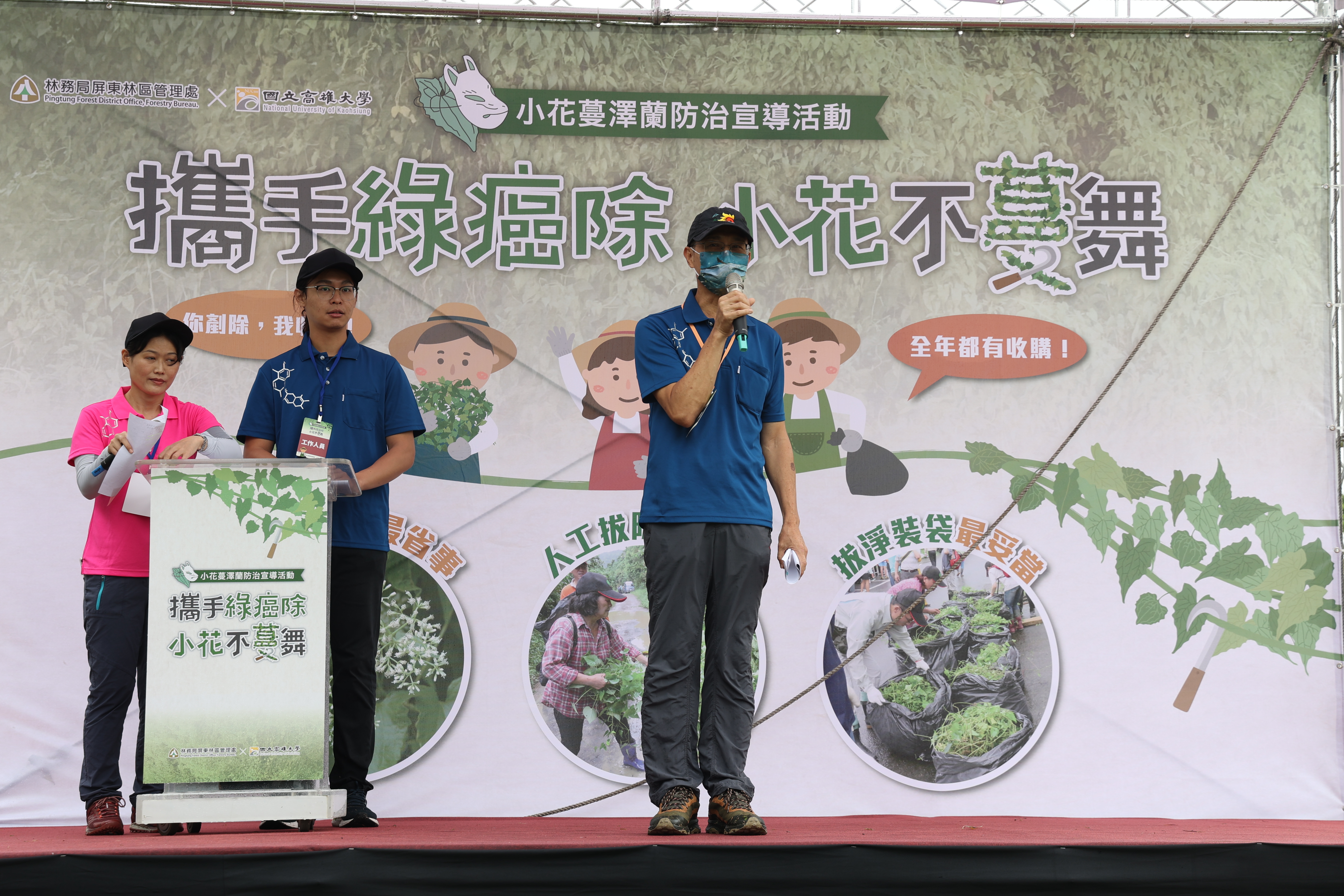 有「植物殺手」之稱的小花蔓澤蘭,為強勢外來入侵植物,嚴重威脅台灣原生植物生長空間。每年10月至隔年2月為其開花結實期,在開花結實前剷除最能降低危害。行政院農業委員會將每年8月15日至9月15日訂為小花蔓澤蘭全國防治月,9月第1個週六為全國防治日,各地持續擴大宣傳加強民眾防除觀念。 今年全國防治日雖受到軒嵐諾颱風影響,林務局屏東林區管理處與國立高雄大學仍不畏風雨攜手在校園東湖舉辦除蔓活動,學校教職員生、在地藍田里居民及高雄健身工廠員工在風雨中都提早到場參加,超過200人共同響應分組除蔓趣味競賽,半小時共拔除968公斤的小花蔓澤蘭植體,其中拔除241公斤植體的藍田里隊奪得拔蔓王冠軍。 民眾拔蔓後也熱烈參與宣導攤位活動,工研院的小花蔓澤蘭醋液、薰香、生物炭等驅蚊及土壤改良劑最受青睞;裕雋生物科技公司透過小花蔓澤蘭具再生特性,開發面膜與修護霜美容產品;高雄市甲仙愛鄉協會也指導民眾DIY小花蔓澤蘭植物提袋敲染及蛋染體驗,十分有趣。 屏東林管處副處長朱木生表示,高雄大學是一所綠色生態大學,致力於推動環境永續之核心價值理念,將SDGs推廣導入教學研究與行政領域。98年本處曾與校方在此合辦植樹活動,如今綠樹成蔭逐漸茁壯,然而強勢的外來入侵植物也悄悄攻進校園,為了還給東湖美麗的「森容活湖」原貌,今年再度攜手除綠癌,不再讓小花蔓澤蘭「蔓佈」在校園。 高雄大學副校長吳宗芳致詞表示,高雄大學生態豐富,生態環境更需要大家一起努力,未來希望繼續跟各單位合作舉辦類似活動,一起努力。 屏東林管處所轄的六龜工作站也同步在六龜區扇平林道與林試所六龜研究中心、中興社區發展協會及社區民眾舉辦小花蔓澤蘭移除活動,參與人數共約60人,移除470公斤植體,不畏風雨,一同為環境付出行動決心。 為鼓勵民眾投入除蔓行列,今年度起林務局全年辦理收購小花蔓澤蘭,民眾可於每週二、四上午9時到12時,下午1時至4時至屏東林管處所轄4個工作站辦理,收購價格為每公斤5元,收購數量無上限。詳情請追蹤屏東林管處臉書。
