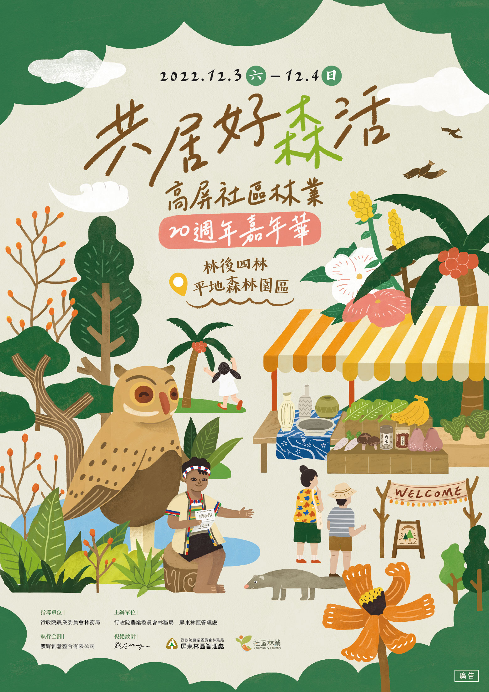 林務局推動社區林業計畫至今年剛好滿二十週年,屏東林區管理處為展現與社區林業夥伴間的合作成果,以及鼓勵社區持續發展生態友善旅遊並向民眾秀出社區產品研發亮眼成果,12月3、4日在林後四林平地森林園區舉辦「共居好森活-高屏社區林業20週年嘉年華」,活動包含社區林業亮點成果展示、免費森林走繩體驗活動、週末林下音樂會、森林市集、贈送購物金、票選人氣社區攤位抽好禮等多樣活動,邀請大小朋友們一同共襄盛舉。 林務局自91年開始推展社區林業計畫以來,在高雄、屏東、澎湖等縣市迄今已執行有430件社區林業計畫,參與之社區組織逐年成長,且整體發展面向更多元。現行的社區林業計畫,依執行內容可分成「生態保育篇」、「森林保護篇」、「森林育樂篇」、「樹木與生活篇」四篇章,依法設立登記有案之社區發展協會、文史工作室等與社區事務相關之非營利性團體、基金會、合作社及大專院校皆可於每年10月1日至10月31日向所在地的林管處下轄工作站完成提案申請,計畫執行及結案期間以翌年1月1日至10月31日為原則,相關詳情可至社區林業計畫申辦資訊網 (https://communityforestry.forest.gov.tw/) 查詢。 社區林業是一種小規模的森林管理模式,以社區營造的精神,鼓勵社區民眾共同參與周邊森林的經營,賦予在地守護生態環境的使命並帶來永續利益!此次歡慶社區林業二十週年,特規劃以嘉年華同樂方式,邀請社區透過市集展現社區成果特色,更將榮耀頒發社區林業四大獎項,包含:行動潛力獎、思維創新獎、在地希望獎、環境貢獻獎等,共計16個社區入選,將於12月3日(六)上午精彩舞台活動中頒獎表揚,以鼓勵地方社區產業有更多機會參與,也期待未來有更多夥伴加入社區林業的行列,共同開發出各地社區的獨特資源及迷人之處,朝向永續發展邁進! 林務局屏東林區管理處誠摯邀請大家來到林後四林平地森林園區「共居好森活」,為讓民眾體驗森活的多種樂趣,12月3日特地邀請臺灣專業走繩團隊分4個場次讓民眾參與林下走繩,名額有限,歡迎大家來到活動現場到服務台填妥問卷並完成粉絲頁按選,即可領取免費體驗卷、限額200名!詳細活動資訊請至林務局屏東林區管理處FB粉絲團查詢(https://https://www.facebook.com/pingtung.forest.gov.tw/) 。