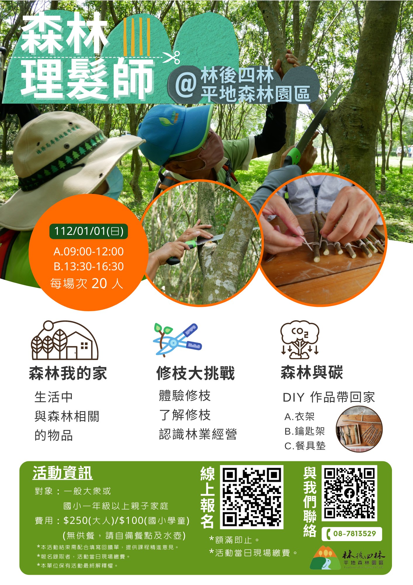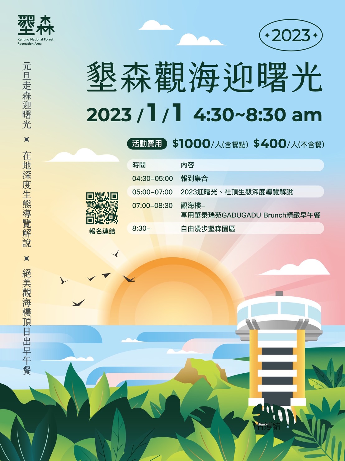 告別2022,我們為您準備好迎接2023好森的第一個連假了,揮別疫情後的最佳選擇就是來森呼吸,提升自我免疫力了,來吧!讓森林為您服務吧。走進屏東林管理處為您準備的不同的森林及活動,用森呼吸展開新年的第一天。 為迎接2023元旦連假期間,我們在所轄藤枝、雙流以及墾丁等國家森林遊樂區,林後四林平地森林園區等,安排了一系列活動,為大家提供親近自然的森林場所,展開幸福健康的新年。 在國境之南有一日限定「2023墾森觀海迎曙光」小旅行,墾丁國家森林遊樂區觀海樓坐擁世界級360度山海景色,可一覽太平洋、巴士海峽、台灣海峽,三面環繞無敵海景,更是新年迎曙光的獨家景點,同時可享用華泰瑞苑GADUGADU秘境餐廳早餐,不容錯過迎接專屬獨特的新年。此外,首次與藍米克全人教育協會共同舉辦「海洋光呼吸藝術展」,感受嶄新的視聽饗宴。亦可順遊園區獨特擁有五十萬年形成的高位珊瑚礁石灰岩景觀和洞穴、茄苳巨木、銀葉板根、白榕林等自然景觀,更是知性與感性兼備! 擁有豐富負離子的雙流國家森林遊樂區,給你滿滿的芬多精,迎新年於111年12月31日至112年1月1-2日辦理「2023新森活運動」系列活動,活動包含了新森活市集 𝘅 森日音樂會 𝘅 雙流森呼吸闖關趣 𝘅 森活小小觀察家。說走就走,𝟮𝟬𝟮𝟮年最後一天提早出發,以輕盈步伐出走,親近「雙流」這個擁有豐富芬多精原始步道和山谷吊橋的森林遊樂區,一起迎新 𝟮𝟬𝟮𝟯新森活,是放鬆身心的絕佳選擇。 位於潮州的林後四林平地森林園區,是讓喜愛森林的朋友們在平地也可以感受森林的氛圍的地方。迎新年的第一天你也可以化身成為職人幫森林整理儀容,為您準備「森林理髮師」的課程,體會與森林共處,從為林木修枝的體驗與操作中,認識修枝、撫育前後的林木生長狀況,了解平地森林在自然碳匯所提供的服務,自己親手製作的木工藝品外,讓大家體會原來每個人都可以為淨零碳排盡一份心力,為新年注入一股新能量。 最後,享有南部小溪頭盛名,位居中海拔高度的藤枝國家森林遊樂區,我們邀請在地二集團部落於森濤平台推廣原生山茶及手沖咖啡品嘗體驗,讓遊客們身處雲霧中森呼吸,還可以品茶、咖啡,是迎接新年的一大享受。另外還鼓勵在地部落友善栽植咖啡、梅子、紅肉李、水蜜桃等農產品,也可以一起帶回家與家人分享喔。入園提醒,遊客需事先申請方式入園(每日限額800名)。遊客入園需自聯外道路16.5公里以步行方式前往,是新年伊始,就能開展鍛練腳力的好所在。 元旦連假各場域相關活動資訊,請至林務局屏東林區管理處粉絲專頁查詢:https://www.facebook.com/pingtung.forest.gov.tw