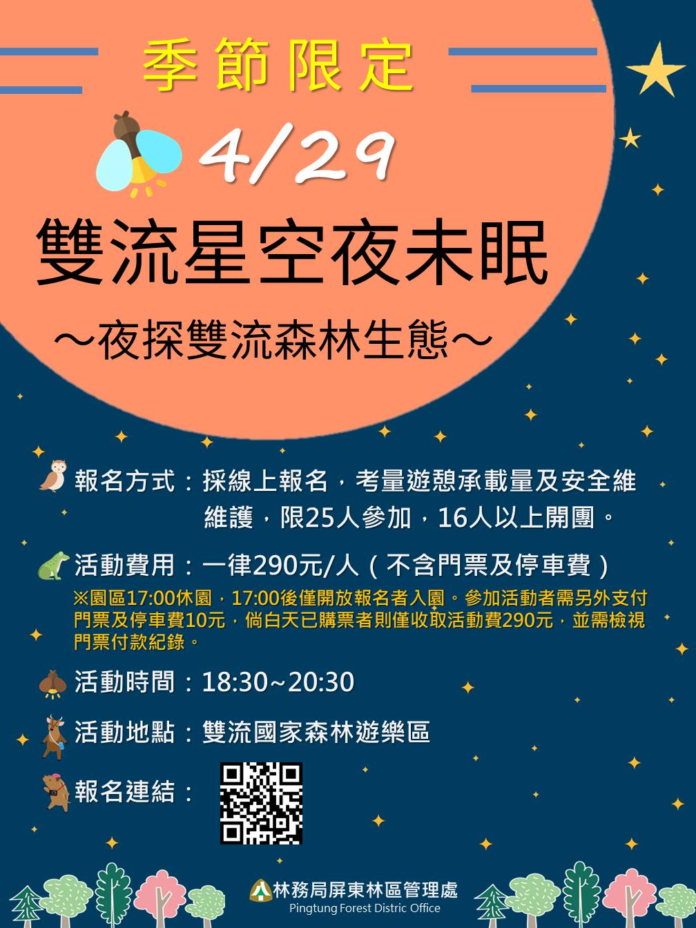 您知道夜晚的森林是什麼樣子嗎?您想探索森林裡動物的夜間生活嗎?雙流國家森林遊樂區將在112年4月29(六)舉辦「雙流星空夜未眠」季節限定主題活動。透過活動將讓民眾體驗在雙流國家森林遊樂區夜間觀察,一同揭開夜晚森林的神秘面紗,認識夜間會出現的各種生物,機會千載難逢歡迎大家踴躍報名參加! 為了讓更多的人可以體驗在雙流觀察夜間生態,雙流國家森林遊樂區特別在112年4月29日(六)舉辦夜觀活動,讓喜歡大自然的大小朋友報名參加。當天空的黑幕拉起,就由森林志工老師們帶領大家一起走入夜晚的森林,打開五官去感受與尋找,有哪些神秘的生物在入夜後活動,聽聽青蛙的歌聲,運氣好還可以看到穿山甲、白鼻心、食蟹獴,甚至難得一見的麝香貓。更歡迎您一早就到園區裡,體會白天到夜間的生態差異,將雙流生態之美一覽無遺! 「雙流星空夜未眠」活動採線上報名,每人報名費用290元,限量25位,歡迎有興趣的民眾報名參加,心動不如馬上行動!詳細資訊請搜尋雙流國家森林遊樂區FB粉絲專頁。