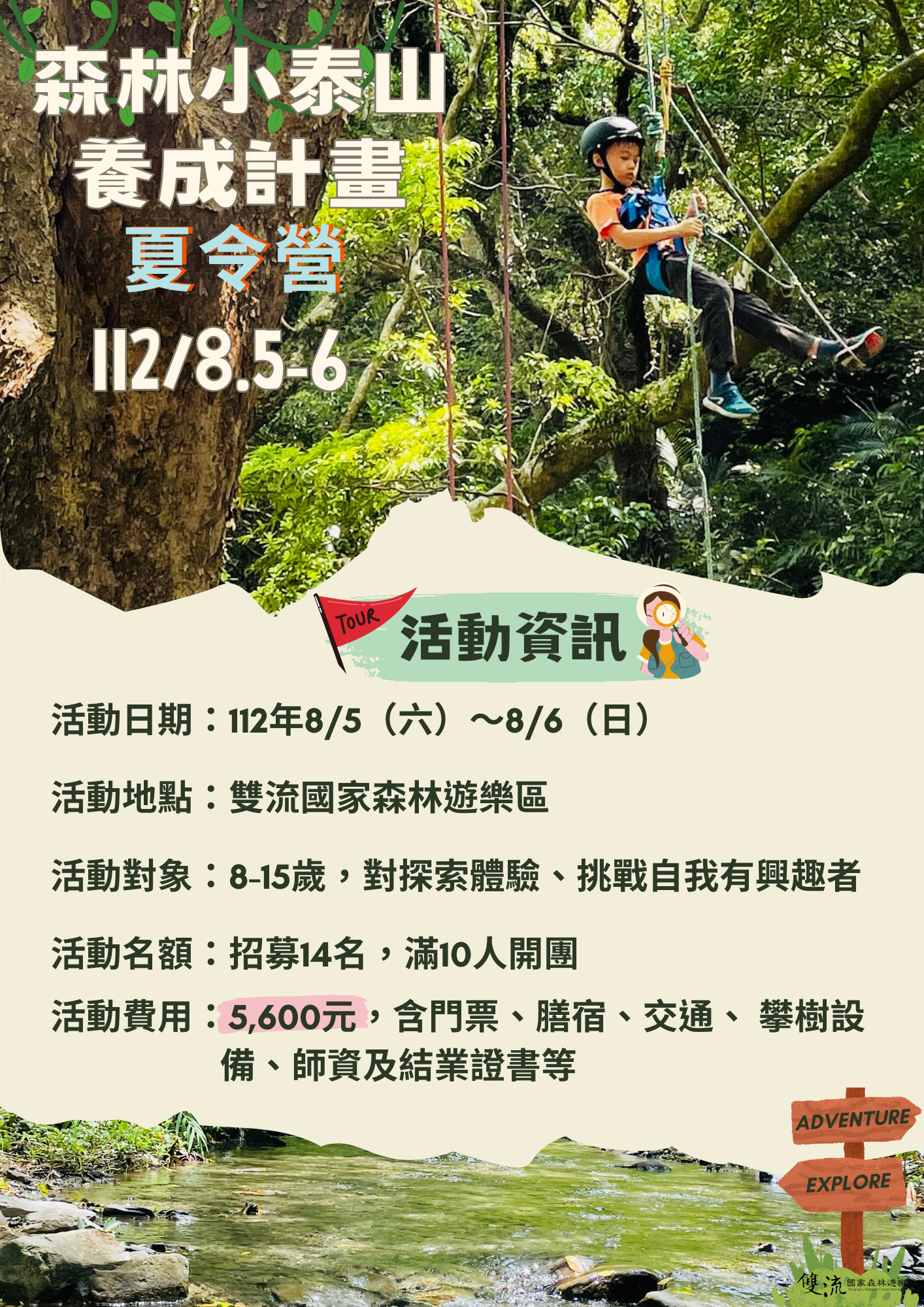 最精彩的夏令營就在森林裡!這個夏天,為孩子們規劃一場特別的體驗吧!讓孩子憑藉著自身能力攀至綠巨人的肩上,看到不同於以往的視野及樹冠層,感受樹木的生命力及風的吹拂,體驗像森林小泰山穿梭在林間的暢快! 為了讓孩子們遠離3C親近大自然,屏東林區管理處在雙流國家森林遊樂區規劃以探索體驗—攀樹教育為主軸的優質體驗活動,活動將在112年8月5~6日展開,特別為8~15歲對攀樹體驗及挑戰自我有興趣的孩子們量身打造,規劃了二天一夜「森林小泰山養成計畫夏令營」,運用雙流得天獨厚的戶外環境,讓小泰山們與大樹來場親密接觸,僅此一團,機會千載難逢,歡迎大家踴躍報名! 「森林小泰山養成計畫夏令營」讓孩子體驗在森林裡生活,跨出舒適圈,化身為森林小泰山,系統性地學習 — 由觀察樹木的健康度,到自己打攀樹繩結、架設攀樹系統、上下樹及器材的回收等攀樹師技能;另外還規劃了隱藏版的夜間生態觀察,走入夜晚的森林,打開五官去感受與尋找,有哪些神秘的生物在入夜後活動,聽聽青蛙的歌聲,運氣好還可以看到穿山甲、白鼻心、食蟹獴,甚至難得一見的麝香貓!課程完成後還能獲得結業證書,留下精彩的暑期回憶。 本次活動採線上報名,每人報名費用5,600元,限量14個名額(滿10人成團),費用包含門票、餐食、住宿、交通(往返潮州火車站—雙流)、教材、攀樹設備、課程活動體驗費、魔術頭巾1份、結業證書。歡迎有興趣的朋友們趕很報名參加,心動不如馬上行動!詳細資訊請搜尋雙流國家森林遊樂區FB粉絲專頁。