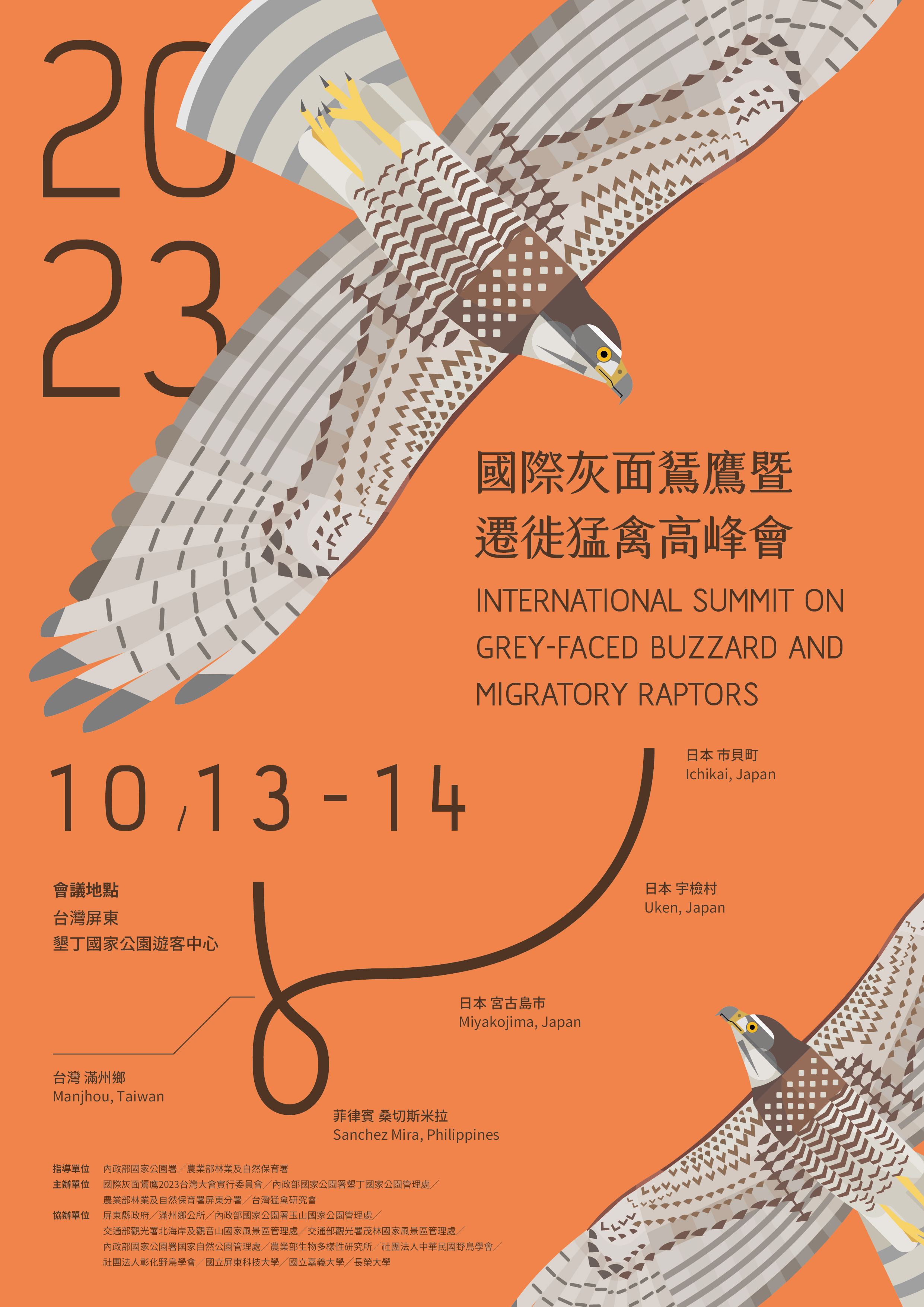 「2023國際灰面鵟鷹暨遷徙猛禽高峰會」將於10月13-14日在墾丁國家公園遊客中心舉辦。本會議由日本、臺灣、菲律賓等國發起,今年為第三屆舉行,目的在串聯灰面鵟鷹及東亞遷徙猛禽的繁殖地、度冬地與過境地各國,以國際行動共同守護珍貴稀有的猛禽資源。 臺灣位於東亞遷徙猛禽的重要路徑上,每年有數十萬隻遷徙猛禽通過臺灣,利用淺山環境休息覓食。遷徙猛禽是春秋兩季臺灣各地重要的生態觀光資產,春天可在新北市觀音山、彰化縣八卦台地等地欣賞灰面鵟鷹北返,秋天則於臺東四格山、屏東里納禮、滿州等地觀看大群灰面鵟鷹、赤腹鷹南遷時形成的壯闊「鷹河」美景。在觀賞之餘,也需要透過國際間串聯來確保遷徙猛禽族群數量狀況。 本次會議由墾丁國家公園管理處、農業部林業及自然保育署屏東分署、台灣猛禽研究會共同主辦,會議上將有日本栃木県市貝町、鹿兒島縣宇檢村、沖縄縣宮古島市以及菲律賓Sanchez-Mira 等地方政府代表,以及日本亞洲猛禽研究保育聯盟、菲律賓Raptorwatch Network Philippines和泰國The Flyway Foundation等代表分享各國灰面鵟鷹暨遷徙猛禽現況。臺灣將由墾丁國家公園管理處、農業部林業及自然保育署屏東分署、生物多樣性研究所、交通部觀光署北海岸及觀音山國家風景區管理處、茂林國家風景區管理處、玉山國家公園管理處、國家自然公園管理處、中華民國野鳥學會、里德社區發展協會等政府及民間單位分享生態研究、教育推廣與棲地管理實務。 墾丁國家公園管理處處長林文和表示希望能藉由這樣的會議串聯國內外合作,為環境和生態系統一同努力。農業部林業及自然保育署屏東分署分署長楊瑞芬也邀請大家在十月安排一趟墾丁賞鷹之旅,除了有知識性豐富的會議,也能到墾丁國家森林遊樂園區參加墾森賞鷹市集。台灣猛禽研究會理事長林思民期許本次會議能夠串起跨國間的合作,促進更多的猛禽研究、教育與保育行動,以保障其永續生存。 本活動將於9月20日開放報名,請透過「 https://neti.cc/DzvAoAx 」或掃描Qrcode報名,名額有限!請民眾把握機會報名。