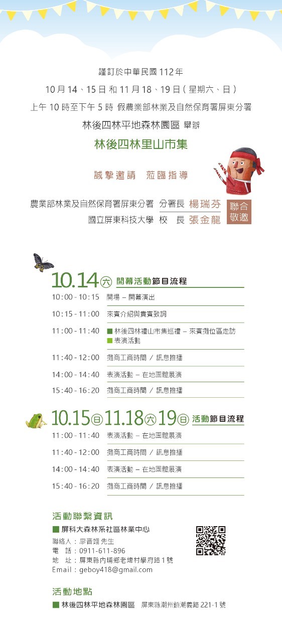 林業及自然保育署屏東分署、屏科大將自10/14~15日,以及11/18~19等假日於林後四林平地森林園區,共同舉辦「林後四林里山市集」。開幕儀式預定於10/14(週六)上午10點15分,由屏東分署長官與屏科大校長共同主持。 里山市集在林後四林平地森林園區已連續辦理第四年,歷年的市集多受到很大迴響,今年邀請在地社群及社區林業夥伴,十八羅漢山自然人文協會、高雄市林園區林園愛鄉協會、霧臺鄉阿禮社區發展協會、霧臺鄉神山社區發展協會等;友善農產、傳統與創意手作、風味美食特色團隊;大武山下的來義鄉、泰武鄉參與林後四林「林學校」的夥伴,原鄉文化農產社區合作社、自然霆沅、屏東縣來義蔬菜產銷班第四班、文樂1-2小農之家等。一同推廣傳統生態文化智慧、培力在地社群共同為了守護里山環境邁進。此外現場也將有創意手作和DIY琉璃月桃編織體驗活動,同時我們邀請部落青年樂團-黑色素樂團、沙曼森樂團、「拾、穗樂團」,帶領大家一起在悠揚的音樂篇章享受森林與音樂之美。 「里山系列市集」始於2019「185農夫市集」,2020年起移師至林後四林平地森林園區擴大辦理,以延續「時令當季、友善生態、小農經濟及尊重在地文化」的里山生活、生產態度,吸引社群民眾漫步森林園區,在森林裡扶老攜幼逛市集的景象,形成熱烈回響。 延續里山倡議核心精神為推廣市集活動之目的,林業及自然保育署透過屏科大陳美惠教授帶領的社區林業團隊共同合作,結合林業及自然保育署推動社區林業、國土綠網、林下經濟及生態旅遊,落實環境友善的里山精神。歡迎國人來到國境之南,感受黃金之秋、享受里山市集之熱絡。