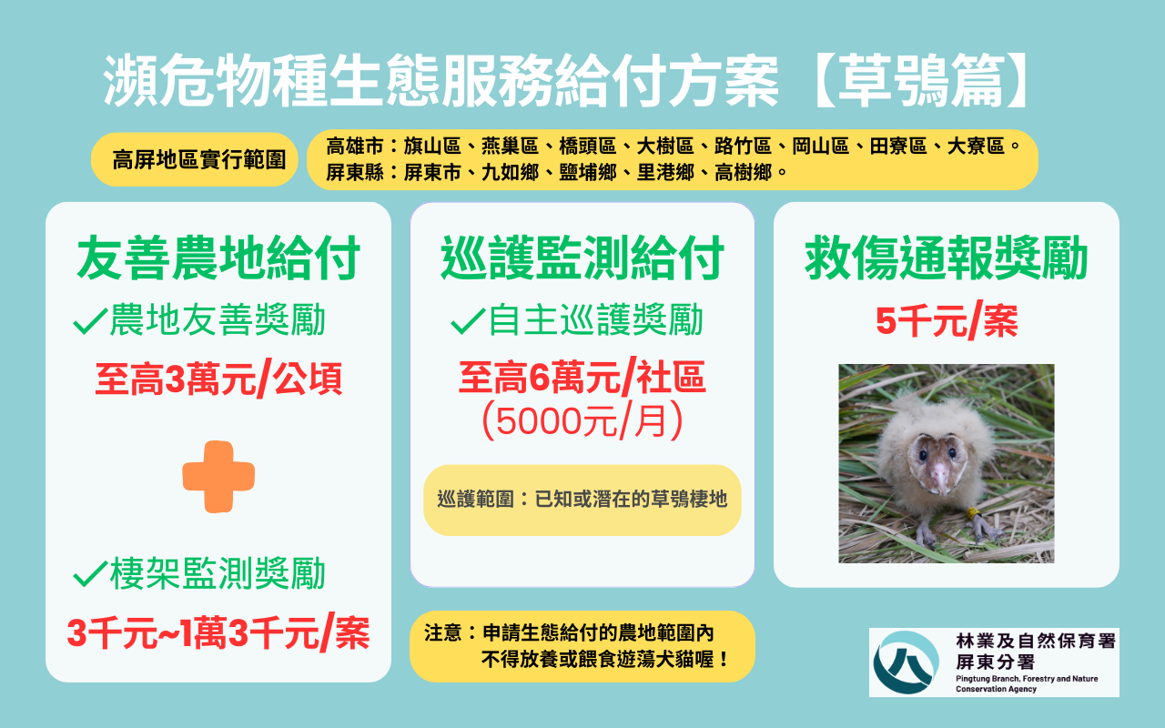 東方草鴞是台灣唯一地棲型的夜行性猛禽,是台灣的特有亞種。夜行性猛禽也就是俗稱的貓頭鷹、晝伏夜出,草鴞成鳥體長約34至42 公分,體重約500克,因具有扁平心型臉,也曾被稱為「猴面鷹」 或「蘋果臉」,主食為鼠類及鼩鼱,能夠捕食臺灣體型最大的鬼鼠,全台數量估計未達500隻,保育位階屬瀕臨絕種保育類野生動物,主要分布於台灣西南部平原丘陵地區。 林業及自然保育署透過長期與生物多樣性研究所、專家學者及民間團體研究調查結果發現,草鴞的棲息環境多與人為活動及農耕區域重疊,面臨的生存威脅包含棲地破壞消失、毒鼠藥危害、鳥網誤補以及遊蕩犬隻侵擾等威脅。因此林業保育署在107年開始推動「國土生態綠色保育網絡建構計畫」,推動跨機關的保育行動,合作推動淺山地區保育工作;林業保育署屏東分署更將草鴞指認為國土綠網「北高雄惡地丘陵淺山森林保育軸帶」以及「高屏溪下游流域保育軸帶」兩條區域保育軸帶內的重要關注物種。繼而,於109年開始林業保育署推出『瀕危物種及重要棲地生態服務給付推動方案』,期與農民攜手以友善環境生產的方式,保護瀕危及重要野生動物與環境;只要用三種方式:農地友善措施、自主巡護及救傷通報等,參與的農友加就可以領取保育草鴞的生態薪水(獎勵金)。 林業及自然保育署與高雄市政府及屏東縣政府分別自110年及111年起合作推動草鴞生態服務給付方案,推動成果豐碩,至今已有200多位農友參與,擴及農地累積超過200公頃。以112年於高屏地區計有96案符合農業友善措施(含有機友善及綠色環境給付等),合作農地面積達130公頃,並架設96處猛禽棲架,共有55處棲架拍到猛禽,其中屏東縣6處有拍到草鴞,累計112年撥付獎勵金超過130萬元。目前113年的生態服務給付推動方案內容已公告於自然保育網(https://conservation.forest.gov.tw/0002186)。 保護野生動物以及關懷我們的生活環境,人人皆可共盡一分心力。爲了讓社會大眾能更瞭解保護野生動物及其棲息地與生態服務給付的關連,我們利用影片來簡要介紹草鴞的生態、保育現況以及生態給付等相關內容,可至Youtube平台觀看影片(https://youtu.be/LE8OAT5wveo?si=NOW-ENVNYtKYwgkM)。最後,林業保育署屏東分署說明,未來將更進一步推廣友善草鴞農產品,讓大家可以由日常生活與消費支持保育,建構生態、生活、生產共好的模式。