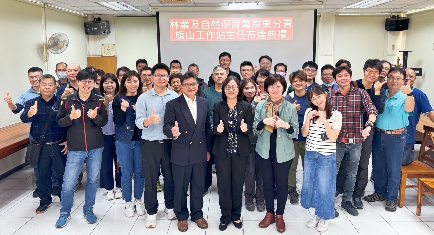 林業及自然保育署屏東分署為增進主管的工作歷練及業務需求考量,旗山工作站主任由森林管理科科長胡淑珠調任,六龜工作站主任由旗山工作站主任林弘基調任,布達典禮於113年2月15日舉行,由分署長楊瑞芬親自監交,典禮圓滿順利完成。 楊瑞芬分署長首先特別感謝卸任主任在工作上的辛勞付出,打下良好的基礎,2位新任主任有豐富的經驗並各有長才,期許在新的一年有新的氣象,對林業工作有另一番新的作為。 楊分署長並表示,旗山及六龜工作站皆有其業務發展重點,包括與那瑪夏地區合作紀錄並保存狩獵文化、協助那瑪夏地區在地勞動合作社成立、建立全材利用循環基地、發展林下經濟等,均有賴2位新任主任率同仁合力持續推動。再以,分署預計今年3月進行森林驗證全區驗證年審稽核,期許同仁深化了解森林驗證原則、準則,內化在平日林業經營作業中,並與林業工作者、在地居民等合作推動展現林業經營成果,為屏東分署推動森林驗證、國產木竹材利用、國土保育往下一個里程碑邁進。