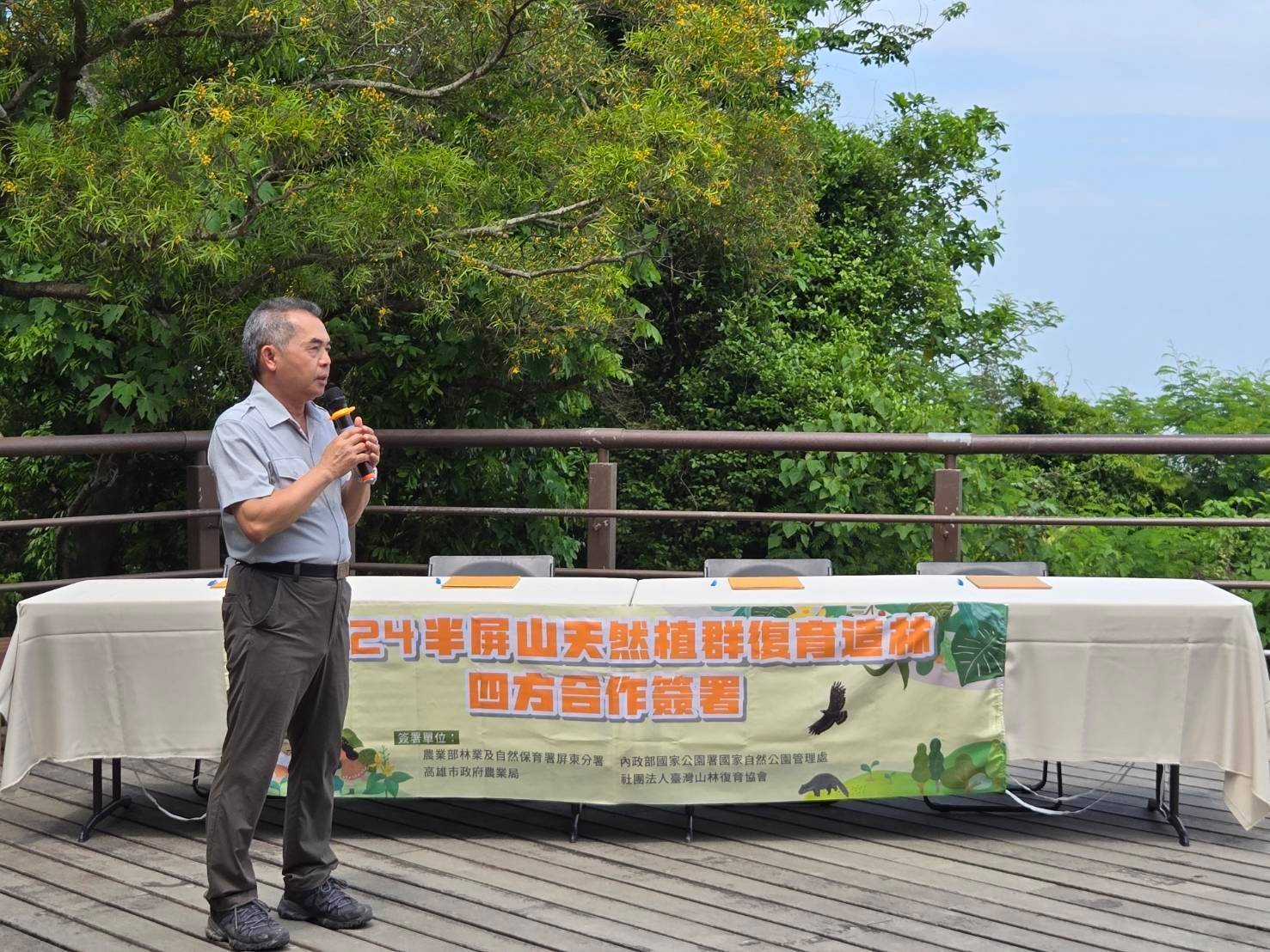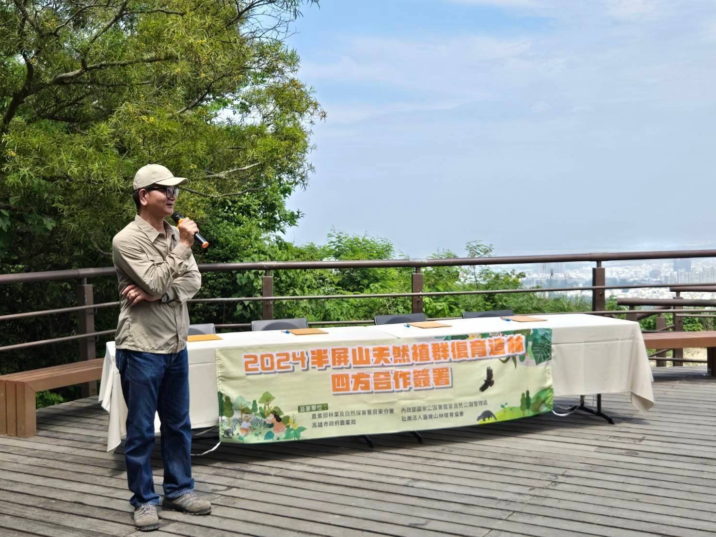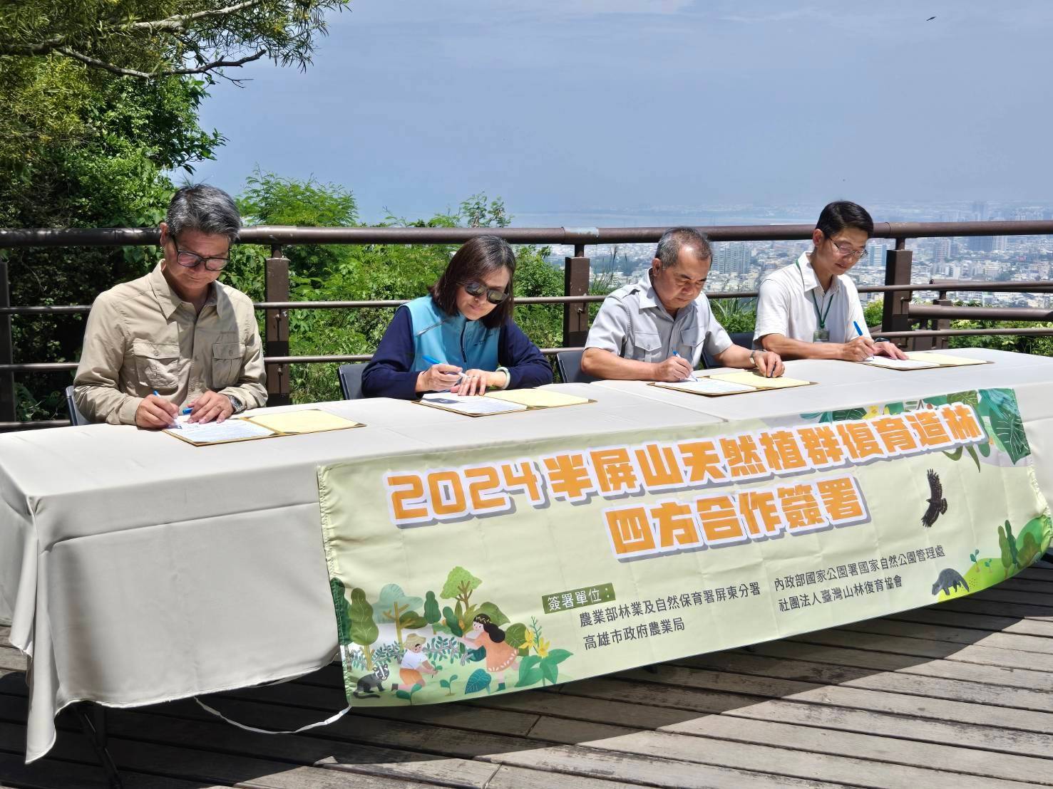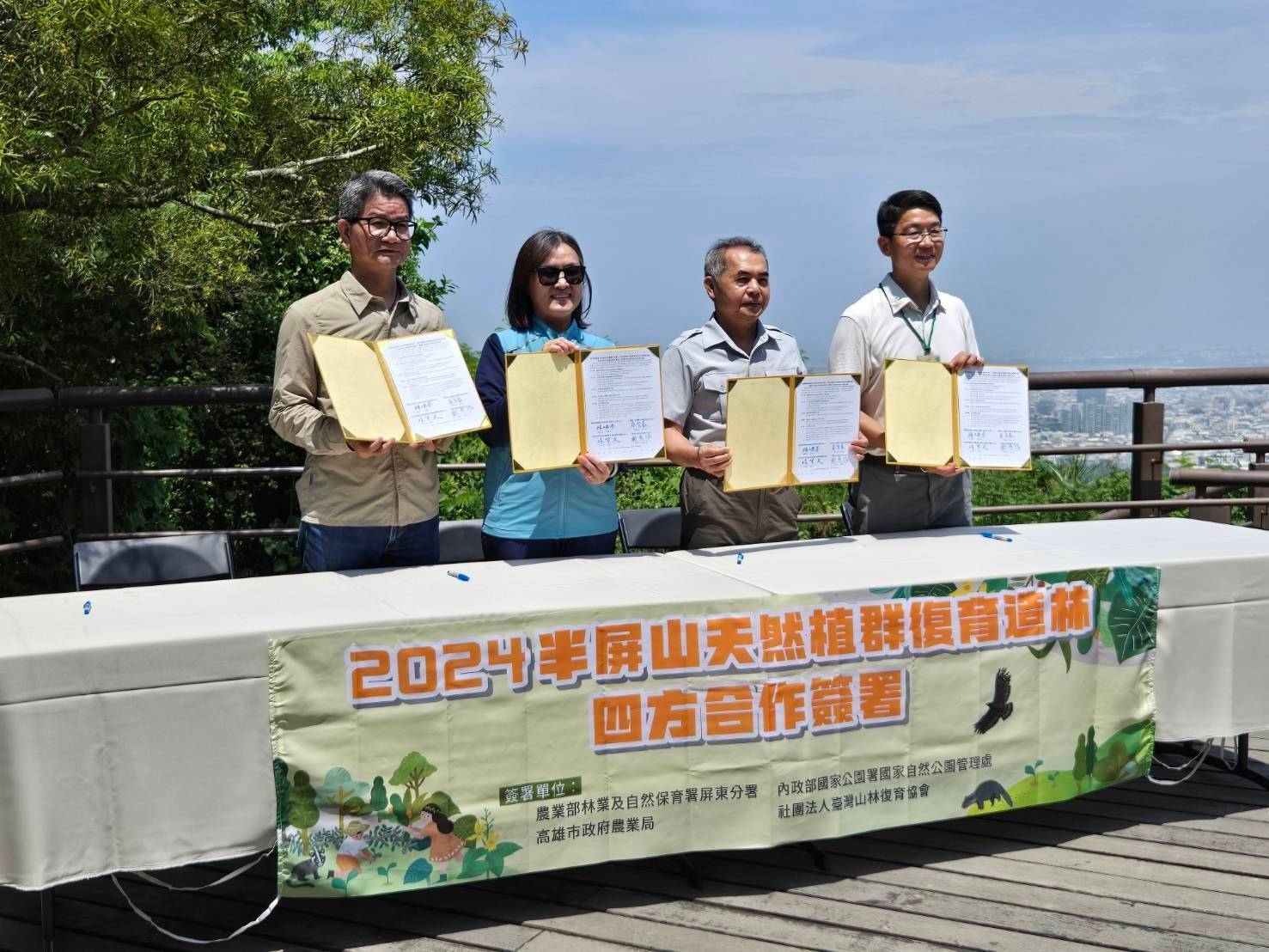 每年的5月22日是生物多樣性日,林業保育署屏東分署楊瑞芬分署長、內政部國家公園署國家自然公園管理處張登文處長、高雄市政府農業局鄭清福副局長及社團法人臺灣山林復育協會蔡智豪執行長帶領4個單位的夥伴,為復育高雄巿左營區半屏山原生植物生態,特別在今日共同簽訂四方合作備忘錄,齊力推動半屏山復育造林工作。 半屏山保安林是北高雄都會區生態廊道的重要據點,但因早期採礦後,為快速植生覆蓋而種植大量銀合歡,導致入侵原生植物的生長範圍。本次半屏山原生植物復育造林活動,是第一次以在地採種在地復育方式進行,所有的小苗都來自半屏山週邊的原生種子;採生態控制法,即不砍除週邊銀合歡上木的方式,直接進行苗木種植,復育造林面積約0.1公頃,種植稜果榕、恆春山枇杷、九芎、大葉楠、皮孫木、水團花、黃荊、無患子、山柚等9種原生樹種等共200株,現場登山民眾也一起參與,人數計75人。 楊分署長致詞表示今天是宣誓、合作、也是執行,今年的生物多樣性主題是be part of the plan,所以我們在半屏山以自然解方的方法復育天然植群,也在百年半屏山保安林的時間軸上,再用一個百年恢復生物多樣性,最後是四個單位願意公私協力全力參與,一定能成功復育原生植群。 張登文處長表示,半屏山是週邊居民重要的自然環境,跟壽山週邊連成一串綠寶石,早期的人為開發對棲地的破壞,也期待開始縫補生態破口,共創更好的生態環境。 鄭副局長清福風趣的說,他簽署的合作備忘錄都一定成功,未來有很多與自然及生物多樣性有關的創新工作可以推動,例如燕巢泥火山環境教育園區,會攜手更多夥伴持續努力。 蔡智豪執行長則從生態功能的意義,告訴大家銀合歡已經佔據了生態棲位,如果全數砍除,也只會創造銀合歡小苗,所以要有演替後期的植物逐步取代銀合歡的棲位,恢復至少100種高雄原生植群,共同見證歷史。 四個公私部門在推動當地植群復育、提升高雄淺山森林生態功能,助益生物多樣性之恢復的共同目標下,由台灣山林復育協會採種半屏山原生植物並進行苗木生長監測、高雄市政府農業局育苗、林業保育署屏東分署及國家自然公園管理處分區造林及撫育,分工合作持續復育當地原生植物,以不砍除銀合歡方式在林下補植增加原生樹種及數量,以至少100種、4800株為目標,今年復育面積0.54公頃,透過跨機關公私協力的合作,以生態方法抑制銀合歡的生長,不大面積人為擾動,慢慢恢復半屏山在地植群及生態環境。林業保育署屏東分署也邀請大家一起行動,關注原生樹苗的生長,共同復育半屏山保安林天然植群的生物多樣性。
