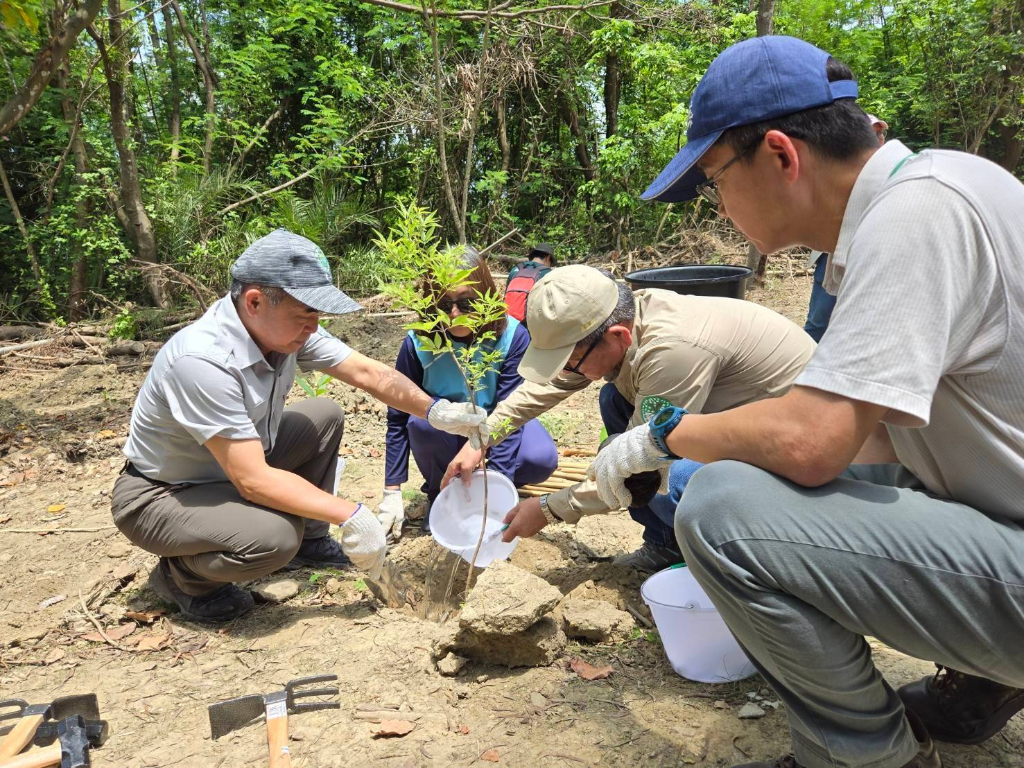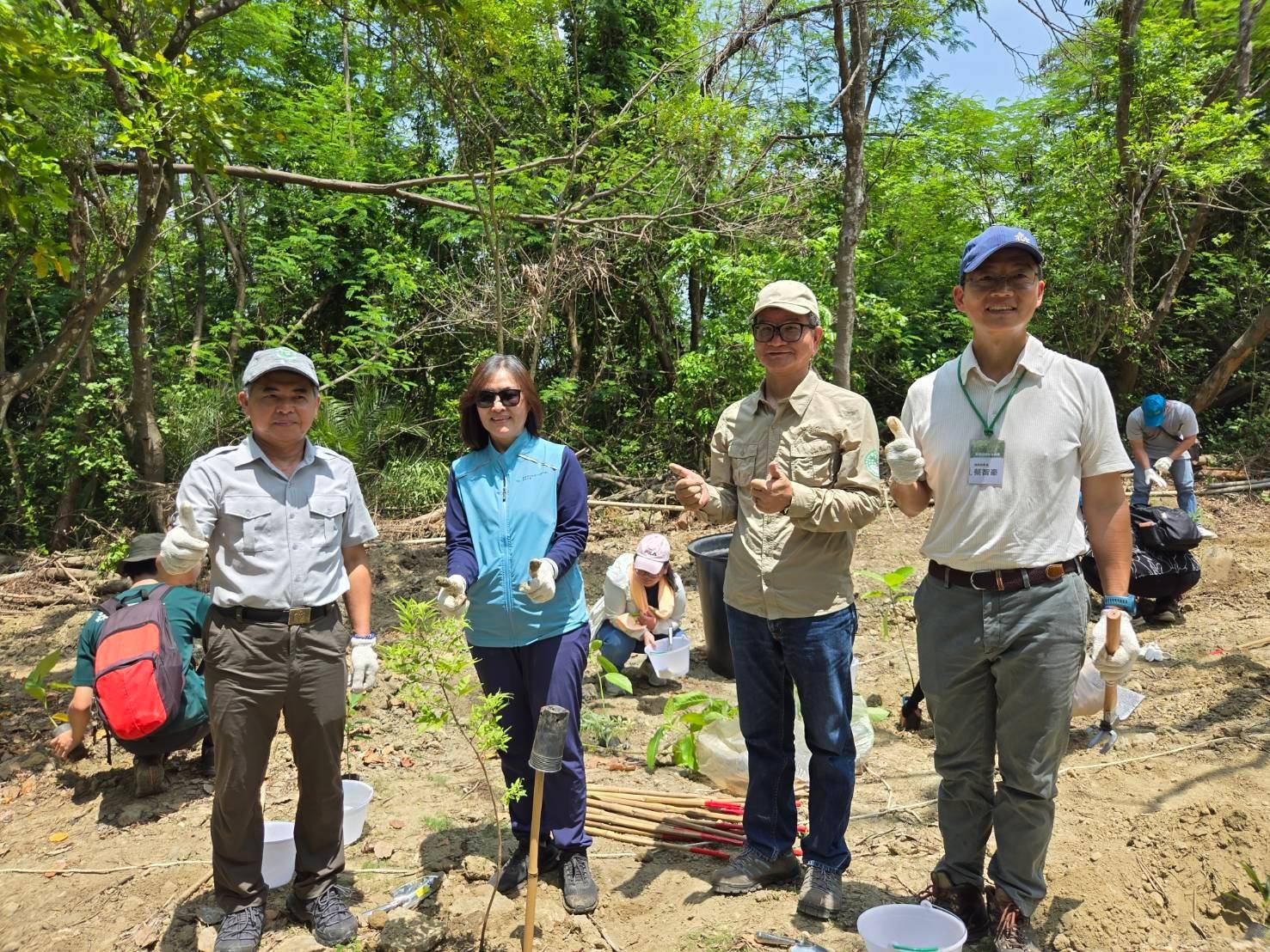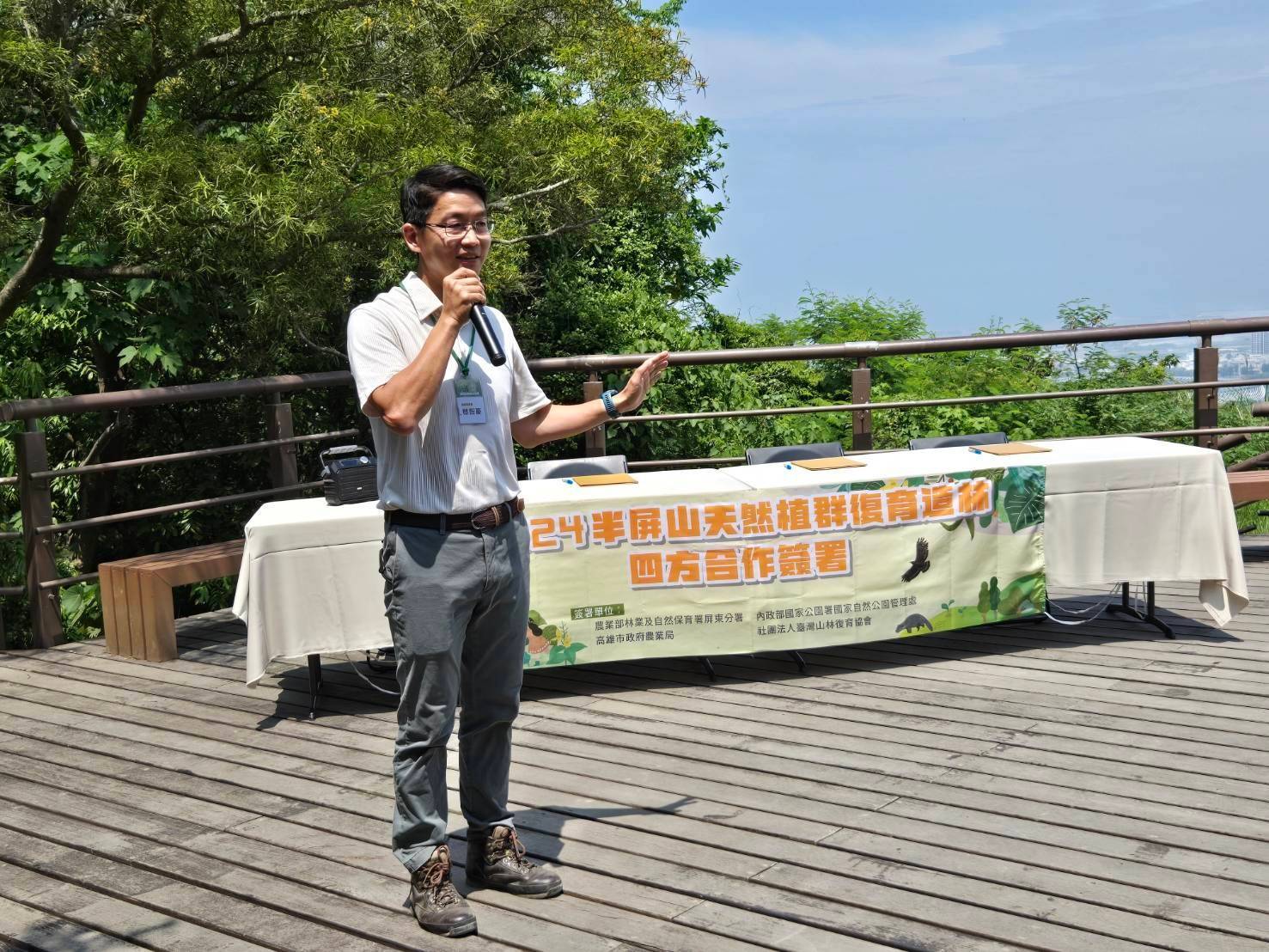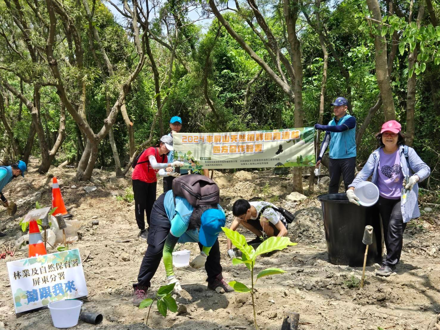 每年的5月22日是生物多樣性日,林業保育署屏東分署楊瑞芬分署長、內政部國家公園署國家自然公園管理處張登文處長、高雄市政府農業局鄭清福副局長及社團法人臺灣山林復育協會蔡智豪執行長帶領4個單位的夥伴,為復育高雄巿左營區半屏山原生植物生態,特別在今日共同簽訂四方合作備忘錄,齊力推動半屏山復育造林工作。 半屏山保安林是北高雄都會區生態廊道的重要據點,但因早期採礦後,為快速植生覆蓋而種植大量銀合歡,導致入侵原生植物的生長範圍。本次半屏山原生植物復育造林活動,是第一次以在地採種在地復育方式進行,所有的小苗都來自半屏山週邊的原生種子;採生態控制法,即不砍除週邊銀合歡上木的方式,直接進行苗木種植,復育造林面積約0.1公頃,種植稜果榕、恆春山枇杷、九芎、大葉楠、皮孫木、水團花、黃荊、無患子、山柚等9種原生樹種等共200株,現場登山民眾也一起參與,人數計75人。 楊分署長致詞表示今天是宣誓、合作、也是執行,今年的生物多樣性主題是be part of the plan,所以我們在半屏山以自然解方的方法復育天然植群,也在百年半屏山保安林的時間軸上,再用一個百年恢復生物多樣性,最後是四個單位願意公私協力全力參與,一定能成功復育原生植群。 張登文處長表示,半屏山是週邊居民重要的自然環境,跟壽山週邊連成一串綠寶石,早期的人為開發對棲地的破壞,也期待開始縫補生態破口,共創更好的生態環境。 鄭副局長清福風趣的說,他簽署的合作備忘錄都一定成功,未來有很多與自然及生物多樣性有關的創新工作可以推動,例如燕巢泥火山環境教育園區,會攜手更多夥伴持續努力。 蔡智豪執行長則從生態功能的意義,告訴大家銀合歡已經佔據了生態棲位,如果全數砍除,也只會創造銀合歡小苗,所以要有演替後期的植物逐步取代銀合歡的棲位,恢復至少100種高雄原生植群,共同見證歷史。 四個公私部門在推動當地植群復育、提升高雄淺山森林生態功能,助益生物多樣性之恢復的共同目標下,由台灣山林復育協會採種半屏山原生植物並進行苗木生長監測、高雄市政府農業局育苗、林業保育署屏東分署及國家自然公園管理處分區造林及撫育,分工合作持續復育當地原生植物,以不砍除銀合歡方式在林下補植增加原生樹種及數量,以至少100種、4800株為目標,今年復育面積0.54公頃,透過跨機關公私協力的合作,以生態方法抑制銀合歡的生長,不大面積人為擾動,慢慢恢復半屏山在地植群及生態環境。林業保育署屏東分署也邀請大家一起行動,關注原生樹苗的生長,共同復育半屏山保安林天然植群的生物多樣性。