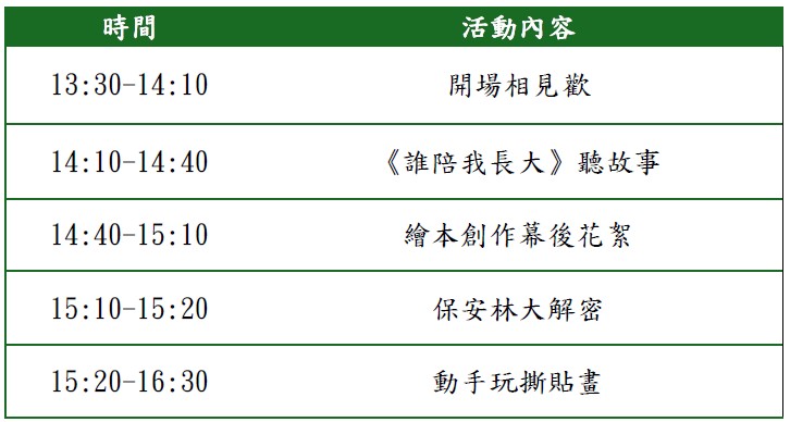 一、活動簡介: 在人生道路上,總是有各式各樣的夥伴們與我們並肩前行。但你是否曾在無意間,忽略了那些默默陪伴著你的守護者呢?《誰陪我長大》是農業部林業及自然保育署屏東分署於今年發行的繪本,也是全臺灣第一本以保安林為主題的繪本創作。透過一個小女孩與保安林精靈之間的故事,生動地呈現了保安林的角色和價值,同時也提醒著我們對這些默默守護我們的自然環境的珍惜與保護。 本場新書發表會由林業及自然保育署屏東分署主辦,特別邀請本書作者黃聿訢進行繪本導讀;繪者林柏廷分享繪本創作花絮,並帶領大小朋友進行撕貼畫創作,透過豐富好玩的活動,共同探索保安林與我們生活之間不可分割的聯繫,讓我們跟隨著繪本中孩子的腳步,重新發現那個充滿自然與美好的世界,並攜手為守護保安林盡一份心力。 二、主辦單位:農業部林業及自然保育署屏東分署 三、執行單位:環境友善種子有限公司 四、活動時間:2024年8月24日(六),下午14:00~16:30 五、參與人數:30人 六、參加對象:各年齡段親子與三代同堂(建議最低參與年齡為3歲以上,一家庭最多開放4位成員同時報名) 七、活動地點:七木人文空間書房(屏東縣屏東市勝義巷7號,位於勝利星村內) 八、活動費用:每一家庭購書入場(定價300元,當日購書特價270元),其餘活動免費參加。事先於網路報名者將於現場報到時獲得繪本周邊小禮物每人乙份。 九、報名方式: 即日起開放網路報名(報名連結如下:https://forms.gle/Z5oBy8HU1UoZAWkN9) 8/12(一)前於本分署粉絲專頁(https://www.facebook.com/Pingtung.Branch.FANCA?locale=zh_TW)公告錄取名單(若提前額滿,將提前公告)。 十、其他注意事項 1.若活動開始後尚未完成報到者,名額將釋放給現場候補民眾。 2.為維護活動品質,及所有報名者的權益。報名後,若無法前來請儘早主動告知,讓其他候補者也享有參與的權利。 3.為響應環保,請自行攜帶環保杯,場域內備有飲用水可供使用。 4.本活動過程將有拍照或錄影紀錄,參加者請同意照片及影片用於環境傳播使用。 5.活動當天如遇天災或不可抗拒之其他因素,氣象局所發布颱風警報及豪大雨特報為準,將取消活動或擇期辦理(必要時將以電話聯絡)。 6.主辦單位保留變動議程之權利。若有任何問題,請聯繫負責人黃聿訢小姐 (07)777-8047(週一至週五09:00-17:00),電子信箱 emily@friendlyseed.com.tw。
