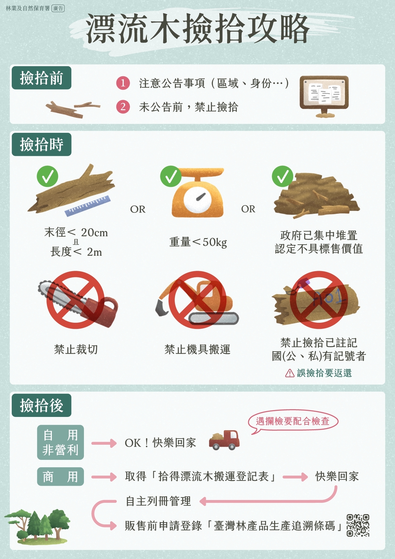 今年7月底凱米颱風過境,屏東縣境內河川、海灘、海岸浮覆地遍布許多漂流木,經各機關積極清理後,屏東縣政府於113年9月9月正式公告自由撿拾漂流木區域,撿拾期限至下一次中央氣象署發佈陸上颱風警報或豪雨特報為止,設籍於屏東縣居民得自由撿拾。 屏東縣行政區域開放撿拾之海岸浮覆地及沿岸海堤區域包括新園鄉鹽埔村及共和村,東港鎮鎮海里,林邊鄉水利村,佳冬鄉塩豐村、燄塩村、賴家村,枋寮鄉大庄村、新龍村、枋寮村、保生村,枋山鄉加祿村、嘉和村、枋山村、善餘村、楓港村,及車城鄉的海口村、福安村、新街村、射寮村等。 國有林區域外,中央管河川部分的高屏溪水系、東港溪水系、四重溪水系,及縣管河川的林邊溪、率芒溪、枋山溪、楓港溪、保力溪、七里溪、石盤溪之河道兩岸及出海口範圍,當地民眾亦可自由撿拾漂流木,惟禁止使用機具搬運野溪、河川區域內之漂流木。 另外凱米颱風造成東港鹽埔漁港堆積大量漂流木,此次農業部漁業署亦已打撈清理集中堆置於海巡署鹽埔安檢所對面突堤(活魚運搬碼頭,詳附開放撿拾區域範圍圖),經屏東縣政府認定不具標售價值的漂流木,民眾亦得自由撿拾。 屏東縣政府特別提醒民眾,各水庫蓄水範圍、港口、軍事區域、國有林區域、國家公園及國家風景區範圍非開放區域,不得撿拾。如須於沿岸海堤區域內或東港鹽埔漁港範圍等管制區域使用機具時,應向水利處、農業部漁業署等管理權責單位申請許可。在鹽埔漁港撿拾期間以不影響現場漁船運搬養殖活動作業使用為原則。以及屏東縣公告得撿拾對象僅限設籍屏東縣居民,請撿拾者務必隨身攜帶身分證件,並隨時注意氣象資訊及自身生命安全。 林業保育署屏東分署則提醒,撿拾漂流木不得裁切,並需符合末徑小於20公分且長度小於2公尺,或重量小於50公斤,無政府註記或啟印標記等,如有撿拾具註記之漂流木,應通報屏東分署潮州工作站或恆春工作站保管。相關注意事項亦同步公告於林業保育署屏東分署官網 https://pingtung.forest.gov.tw/driftwood-news/0074452 。另外高雄市政府持續清理海岸線漂流木中,預計在9月底完成清理後公告自由撿拾漂流木,尚未公告前,請民眾勿前往撿拾,以免觸法受罰。 相關規定可洽詢屏東分署(08-7236941轉224)或屏東縣政府農業處(08-7320415轉3741)及高雄市政府農業局(07-7995678轉6155)瞭解。
