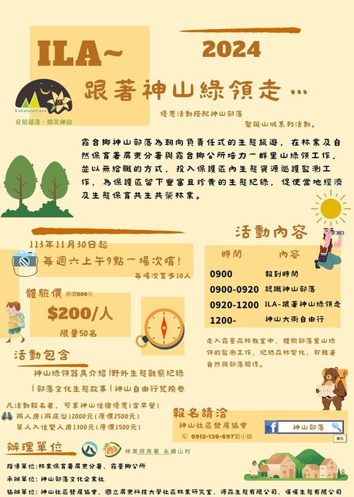 ila~跟著神山綠領走…活動於11月30日起至12月28日止每週六上午開放1梯次,位於隘寮北溪左岸台地的霧臺鄉神山部落,部落內有著特色石板建築及原味美食神山愛玉、小米甜甜圈聞名、頭目家屋、以及各式工坊、民宿、餐廳等知名景點及地方特色小吃,形成臺24線上一個每到假日就有許多遊客駐足之地。 「霧臺鄉自然人文生態景觀區」為台灣第一處原鄉自然人文生態景觀區,生態景觀區涵蓋阿禮、神山及大武等三個部落,在林業保育署屏東分署的支持下,結合國立屏東科技大學團隊,培養了一群里山綠領工作者,成為專業導覽人員,並以無給職的方式,投入生態資源巡護監測工作,為景觀區留下豐富且珍貴的生態紀錄,促使當地經濟及生態保育共生共營林業。 本次ila~跟著神山綠領走…活動,將由神山綠領們帶領大家走入森林教室中,體驗部落里山綠領的監測工作,紀錄下森林中自然資源物候變化,聆聽著自然與部落生活關係,活動以里山倡議的核心精神,透過生態旅遊提升部落永續發展韌性,在經營策略融入林下經濟、混農林業、家庭農園等里山根經濟策略,朝向實質的社區參與保育區發展。 活動報名連結 https://www.facebook.com/share/p/19qK151NGk/