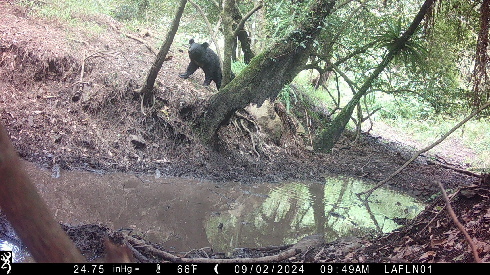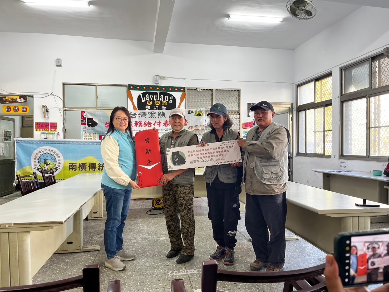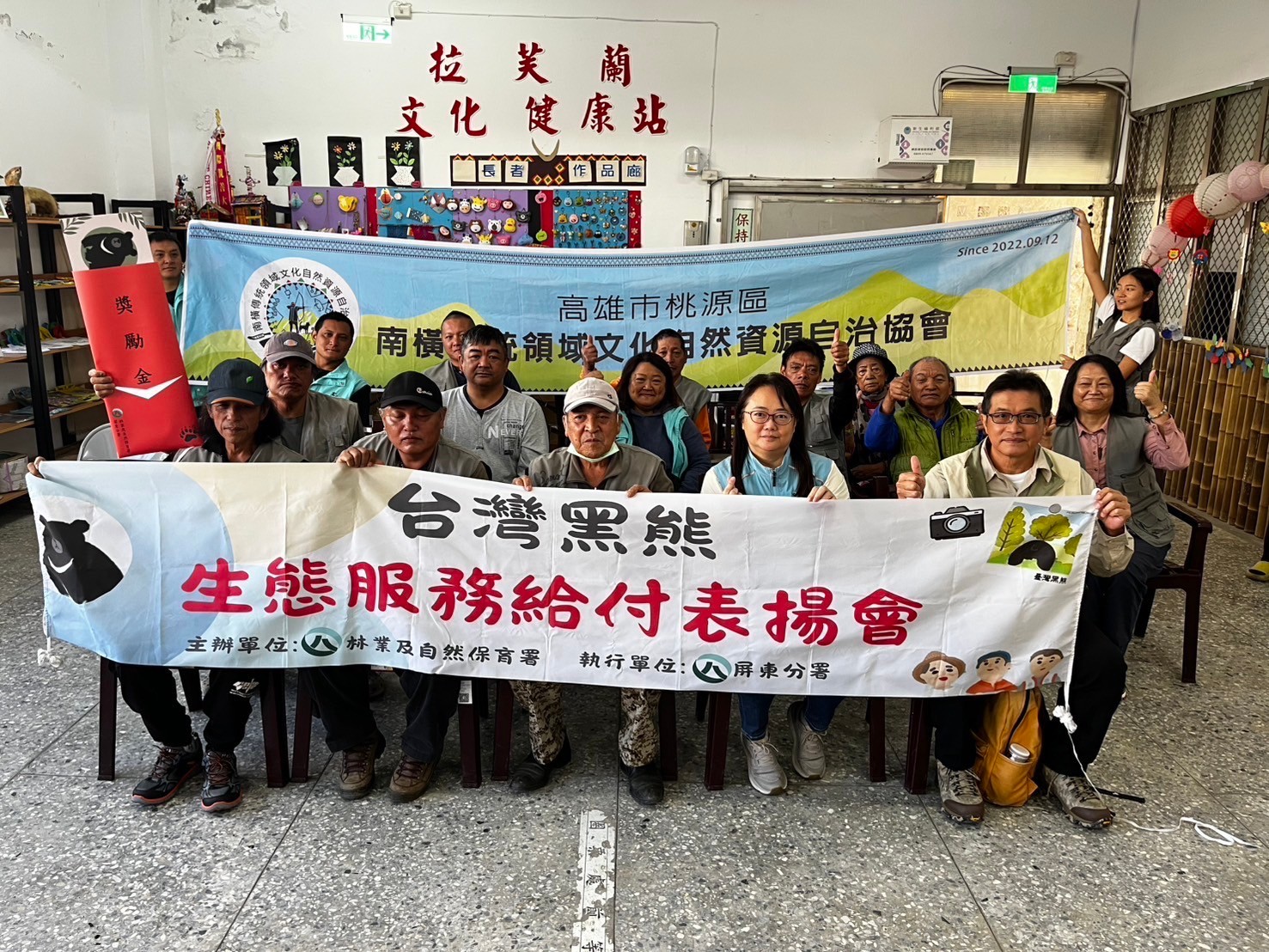 一處位於高雄市桃源區拉芙蘭舊社海拔1,625公尺的水窪,在今年7-8月期間多次拍攝到臺灣黑熊現蹤,不僅記錄到黑熊飲用水源的影像,更記錄到浸泡於水窪中全身泥濘的可愛畫面,此為高雄市桃源區南橫傳統領域文化自然資源自治協會參加臺灣黑熊生態服務給付示範計畫的重要成果,更是林業及自然保育署屏東分署轄內第四筆臺灣黑熊「棲地監測」資料,林業保育署屏東分署特於113年12月10日至協會進行感恩與表揚,感謝部落以實際行動參與黑熊保育。 高雄市桃源區南橫傳統領域文化自然資源自治協會是由桃源區梅山里、拉芙蘭里及復興里三個里共同組成,旨在自然資源的多元治理。於去(112)年10月加入臺灣黑熊巡守隊行列,透過三個里輪流的方式進行巡護,不僅擴大巡護範圍,更可讓更多部落族人加入。 林業保育署屏東分署於感恩表揚活動中,特別感謝協會成員積極投入自主巡護工作,高度肯定黑熊巡守隊的參與,即使巡護路線因受颱風影響有大量倒木、雜草蔓生,巡守隊成員仍不畏艱難的手動移除障礙物,只為完成巡護工作。除了此次棲地監測所拍攝到的臺灣黑熊影像,還曾記錄到黑熊爪痕及熊徑,而這些資料除有助於掌握分署轄區內黑熊的活動範圍,增進了我們對黑熊生活習性的理解,更為後續的保育工作提供珍貴的科學數據。 國立屏東科技大學森林系吳幸如助理教授於2022年陪伴協會至今,今日的感恩表揚會也特別帶領團隊參與,更表示即便在天災影響這麼艱困坎坷的情況下,我們的辛苦還是有回報,真的感到驕傲。 拉芙蘭前主席謝正忠表示很感謝有這個巡護黑熊的工作任務,保護生態這類型的工作,這次小有成果,感謝林保署以及輔導團隊,讓我們有機會體認生態保育,在地人要去守護,所以今天的頒獎儀式,內心感到非常榮幸, 林業保育署屏東分署表示,黑熊巡守隊的努力與投入,不僅守護了臺灣黑熊,也為整個山林的繁榮與永續作出貢獻。在地的部落、協會是推動友善黑熊的重要夥伴,未來,我們期盼持續與各部落密切合作,一同守護山林資源,共同築起屬於我們的生態故事。