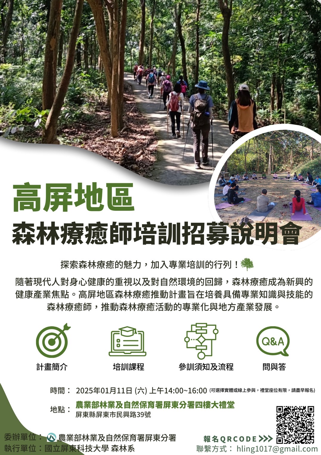 隨著現代人對身心健康的重視及對自然環境的回歸,森林療癒已成為健康產業的新興焦點。為促進高屏地區森林療癒活動的專業化與地方產業發展,農業部林業及自然保育署屏東分署推動「森林療癒師培訓計畫」,並將於2025年1月11日(星期六)14:00至16:00舉行說明會,歡迎有興趣者踴躍參加。 本次說明會將於林業及自然保育署屏東分署4樓大禮堂舉行,並提供線上視訊參與方式。會中將介紹森林療癒的背景與發展現況,說明培訓課程內容與報名流程,讓參與者更全面了解成為專業森林療癒師的機會與挑戰。 森林療癒助力地方經濟與產業發展,亦為林業保育署森林育樂發展重要的一環,是未來促進地方產業與私有林經營活化的新選擇。透過結合森林資源、在地文化與地方特色,森林療癒不僅發揮自然環境的效益,也為南部鄉村地區創造了嶄新的經濟機會。 森林療癒是一種結合自然與健康的療癒方式,透過接觸森林環境,提升心理及生理健康。此計畫期望培養具備專業知能的森林療癒師,推動高屏地區森林療癒活動的永續發展,並帶動地方經濟與健康旅遊產業的成長。無論是對森林療癒產業感興趣,還是希望藉由自然改善身心健康的民眾,都能透過此次說明會了解相關資訊,歡迎踴躍參與。 活動資訊可至林業及自然保育署屏東分署粉絲專頁查詢:https://www.facebook.com/pingtung.forest.gov.tw 。