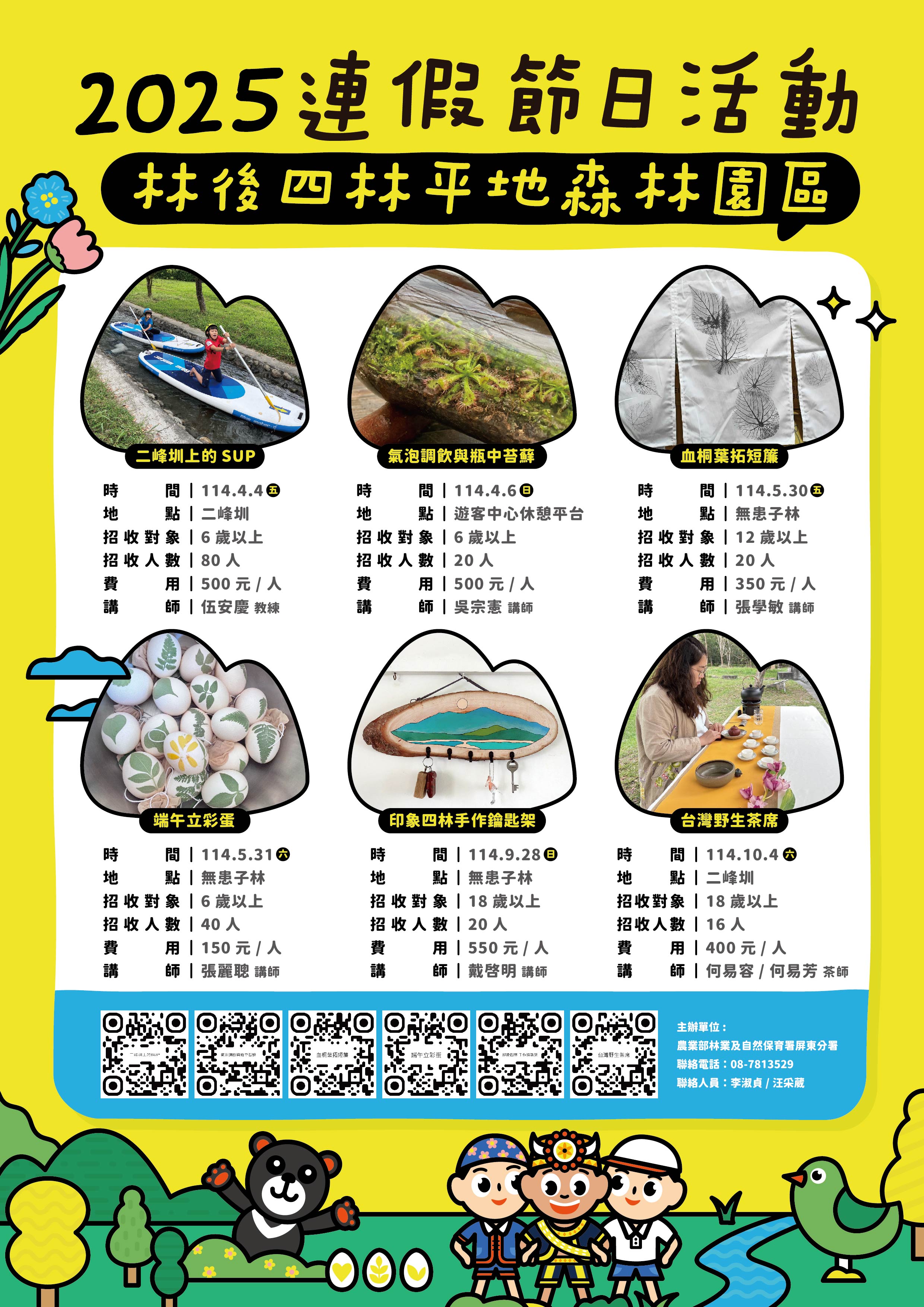 今年春節連假9天,你是否已經走進森林,感受大自然的魅力了呢?接下來,還有兒童節、清明節、端午節等連續假期,不妨趁這個機會,到森林裡走一遭,讓自己徹底放鬆、充電,與大自然來場親密接觸! 林保署屏東分署林後四林平地森林園區,特別結合森林元素,精心規劃了多場精彩活動,邀請您來體驗自然的美好,走進這片“魔法森林”與我們一起體驗每一場活動的獨特魅力,有哪些活動呢? • 4月4日 二峰圳上的SUP:這個活動結合了水上運動和自然景觀,讓參與者可以在平靜的二峰圳水域上體驗立式划槳(SUP),享受水面上的寧靜。 • 4月6日 氣泡調飲與瓶中苔蘚:這場活動結合創意飲品與自然植物,透過調製來自大武山下純淨的氣泡飲品,並由專家教你創作瓶中苔蘚,讓大家學習如何將自然元素融入生活。 • 5月30日 血桐葉拓短簾:這個活動讓大家體驗拓印技巧,將血桐葉的美麗紋路轉印到布料上,製作獨一無二的短門簾,別有一番日式風格。 • 5月31日 端午立彩蛋:五月初五端午立蛋,吸取天地正氣招來鴻運,是端午節正午時分立蛋的傳說。不管鴻運來不來,端午節就是要來玩立蛋。給雞蛋來點顏色瞧瞧,端午應景植物艾草與雞蛋一起來,我們的立蛋就是與眾不同! • 9月28日 印象四林 手作鑰匙架:層疊的山脈,蔥鬱的樹林,蜿蜒的流水... 對於林後四林平地森林園區,你的印象是什麼? 本堂課程將園區中風倒木再度利用,帶領學員觀察園區及植物、學習簡潔品味的配色,以及用基礎的方式繪製,作出一個充滿手感溫度與個人風格的鑰匙掛架,再將這份對四林的印象帶回家,成為居家生活的實用小物。 • 10月4日 台灣野生茶席:中秋佳節,除了賞月和吃月餅,品味一杯來自台灣的野生茶,也是感受這個節日別具一格的方式,並透過茶席體驗,感受茶文化的美好,林後四林平地森林園區邀你一起來喝茶! 園區自開放以來,已經吸引了超過415萬名遊客的光臨。為何這麼多人都愛來呢?除了便捷的交通和宜人的自然環境,這裡還擁有清澈涼爽的水圳、寬敞舒適的野餐草地、龍貓隧道般的無患子樹林,以及春冬季節盛開的紫花楝樹和紫花藿香薊等迷人景觀。對於長時間待在水泥叢林中的都市人來說,這裡簡直就是一片“魔法森林”。走進這片森林,您會感受到頭腦清新、身心愉悅,完全放鬆的快感,這樣的體驗,每一位曾來過的遊客都有深刻的感受。 臺大森林環境暨資源學系的余家斌教授在《森林療癒:從一座森林找到健康》一文中提到,森林療癒中心就是一個綠色健身房的概念,透過參與森林遊憩活動能舒緩身心壓力,且融合森林元素的活動設計,能有效幫助學員放鬆心情、提升專注力。今年,我們為您精心安排以上多項獨特的森林活動,讓您在享受自然美景的同時,也能發現身邊的事物,原來都是大自然賜予的珍貴寶藏。認識這些,您一定會對我們的環境更加珍惜與愛護! 每一場活動都是我們精心設計,目的就是希望讓您能在大自然中放鬆心情,盡情享受愉快的時光!現在就拿起你的手機掃描報名QR碼,輕鬆報名,馬上加入我們吧! 園區資訊網:https://recreation.forest.gov.tw/Forest/FP?typ_id=06001 林後四林平地森林園區聯絡電話:08-7813529