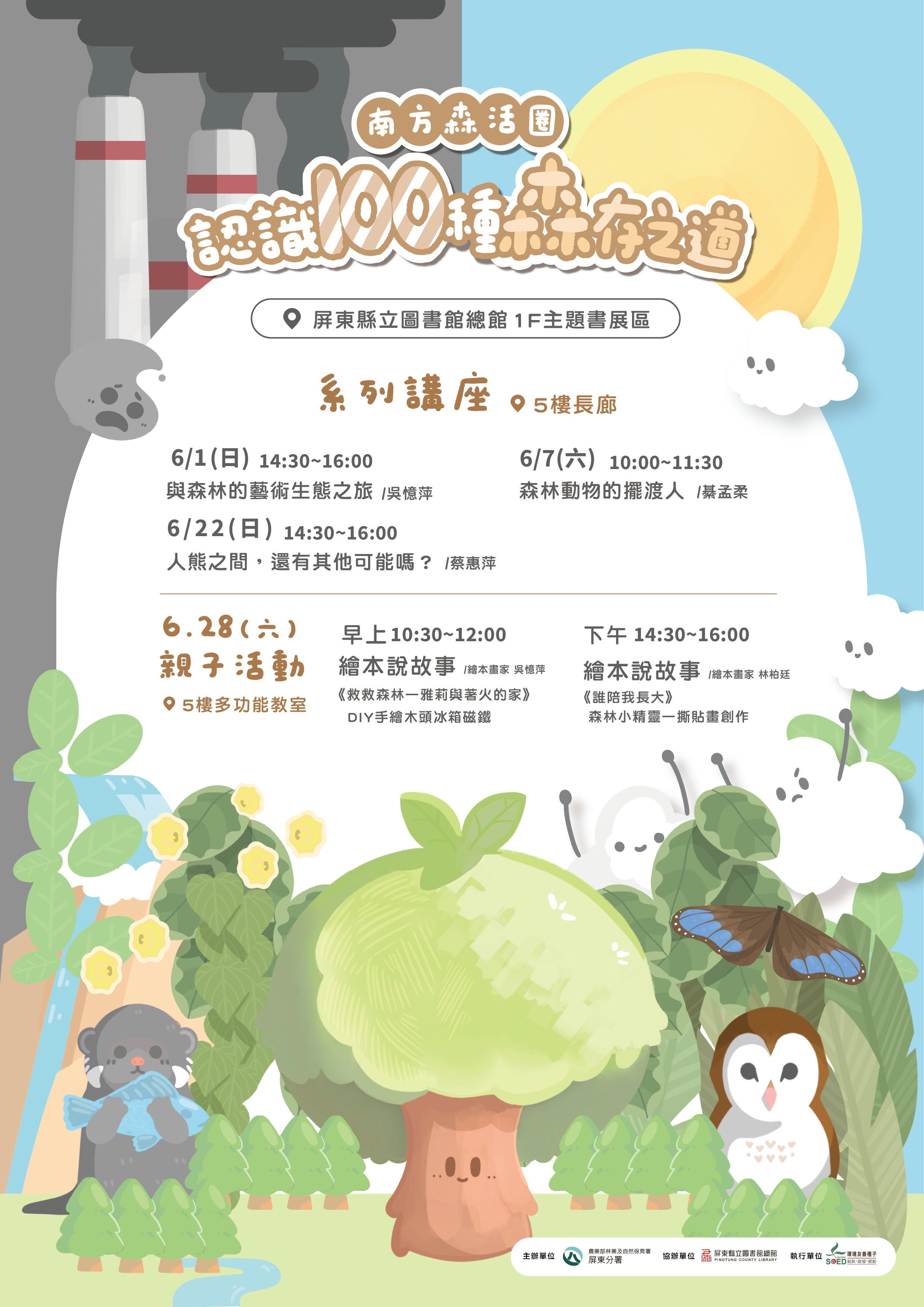 今年6月,林業及自然保育署屏東分署與屏東縣立圖書館總館攜手策劃《南方森活圈——認識100種「森」存之道》主題書展與系列活動。將森林的百種面貌,透過精選森林主題書籍呈現到在民眾面前,以閱讀、講座、親子活動及共創互動等方式,帶領民眾在書香世界中重新認識森林的價值,並反思森林對於人類的生存意義。 書展位於屏東縣立圖書館總館1樓主題書展區,以「生存」為起點,用閱讀開啟生命的「森存之道」。展覽分為「森森不息」、「森入人心」、「護國森山」及「林業保育署專屬選書」等四大主題,橫跨科學、生態、人文與藝術領域。現場同步設有《森林對我來說》共創文學區,邀請每一位來訪者寫下一張關於森林的小卡,並以共創小冊展示於書展,參與民眾可參與抽書活動,讓森林回憶不只是個人的,而是集體共築的文字風景。 本次書展內容豐富,適合全年齡層,期間規劃五場免費系列活動如下: 【森活主題講座】 活動地點:屏東縣立圖書館總館5樓長廊 • 6/1(日)14:30~16:00|與森林的藝術生態之旅|吳憶萍 • 6/7(六)10:00~11:30|森林動物的擺渡人|綦孟柔 • 6/22(日)14:30~16:00|人熊之間,還有其他可能嗎?|蔡惠萍 【森林繪本親子活動】 活動地點:屏東縣立圖書館總館5樓多功能教室 • 6/28(六)10:30~12:00|繪本《救救森林—雅莉與著火的家》+手繪木頭磁鐵 DIY|吳憶萍 • 6/28(六)14:30~16:00|繪本《誰陪我長大》+撕貼畫創作|林柏廷與繪本創作團隊 活動皆採線上報名制,報名從即日起開放至額滿為止。活動當日亦放現場候補。更多資訊請見活動報名連結:https://sites.google.com/view/pingtungbranchfanca 邀請您在這個夏天,來屏東縣立圖書館總館走走,寫一張卡、聽一場講座、讀一本關於森林的書——為這個世界,留下屬於你的「森」存方式。