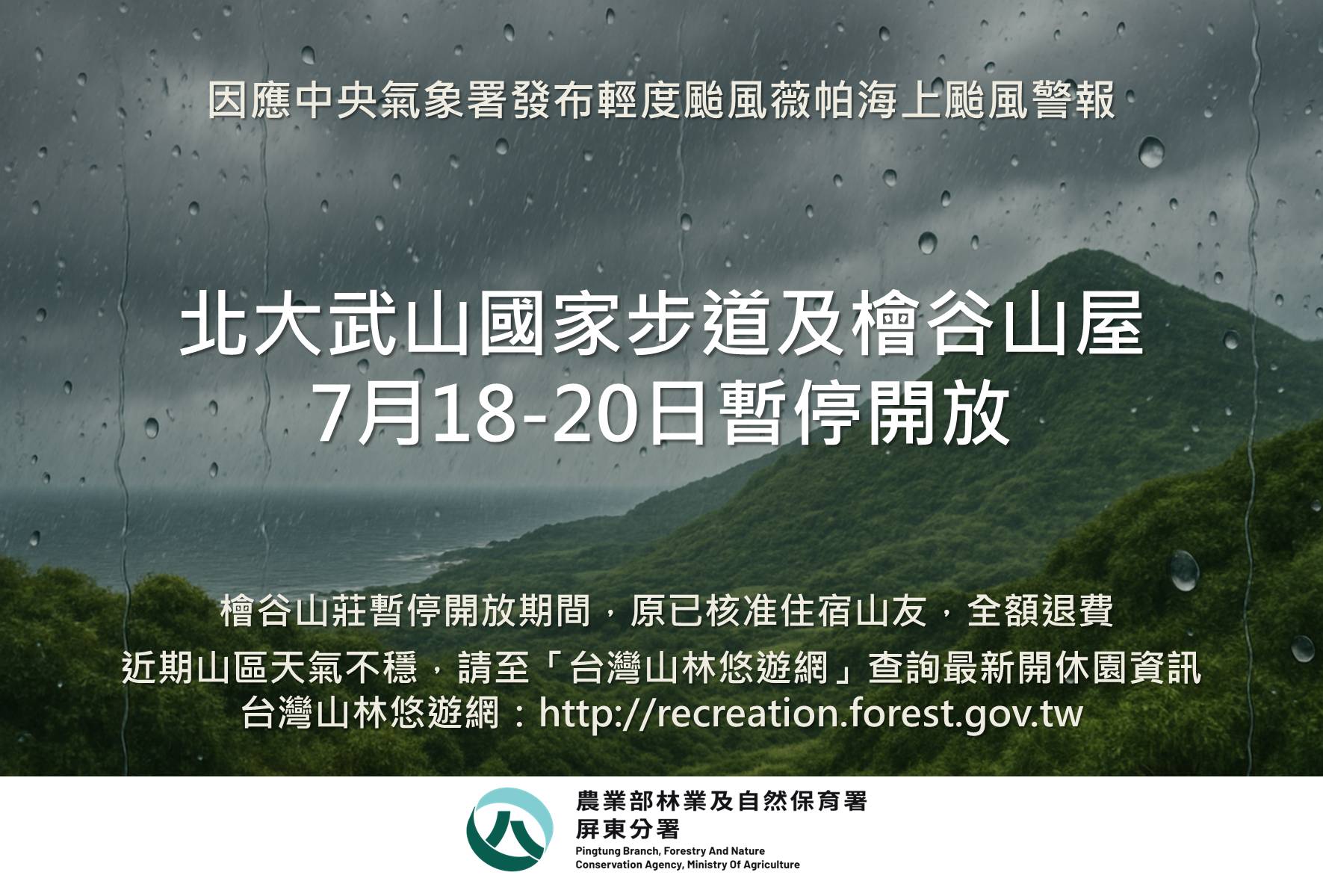因應中央氣象署發布輕度颱風薇帕海上颱風警報,林業保育署屏東分署轄管北大武山國家步道及檜谷山屋於7月18-20日暫停開放。檜谷山莊暫停開放期間,原已核准住宿山友,全額退費 林業保育署屏東分署呼籲,受颱風外圍環流影響,近期山區仍可能有局部豪大雨,前往山區旅遊,仍請留意當地氣象、交通資訊及環境狀況,注意自身安全。更多國家森林遊樂區最新開、休園情形及步道開放訊息,請務必於出發前至台灣山林悠遊網(http://recreation.forest.gov.tw)查詢。