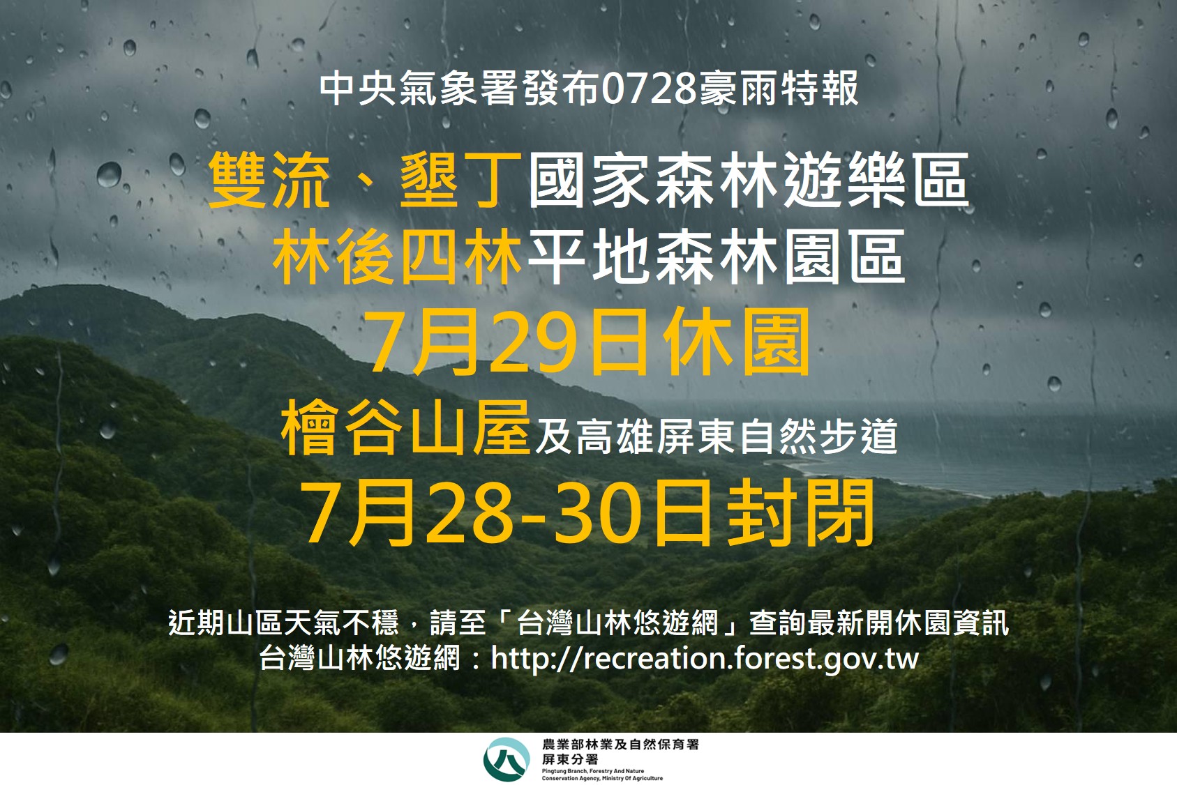 受西南氣流及颱風外圍環流帶來豐沛雨量影響,高雄市、屏東縣政府公告明(7/29)日停班停課,因此林業保育署屏東分署轄管墾丁、雙流國家森林遊樂區以及林後四林平地森林園區7月29日休園一日。 另受天候影響,屏東分署轄管高屏地區、恆春半島自然步道、北大武山國家步道及檜谷山屋於7月28-30日暫停開放。檜谷山莊暫停開放期間,原已核准住宿山友,全額退費。 林業保育署屏東分署呼籲,受環流影響,近期山區仍可能有局部豪大雨,前往山區旅遊,仍請留意當地氣象、交通資訊及環境狀況,注意自身安全。更多國家森林遊樂區最新開、休園情形及步道開放訊息,請務必於出發前至台灣山林悠遊網(http://recreation.forest.gov.tw)查詢。