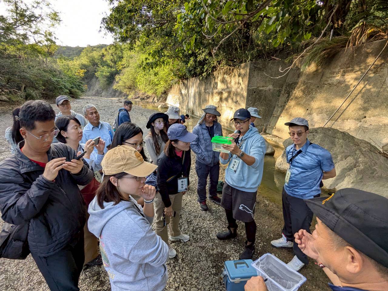 為落實國土生態保育綠色網絡及氣候變遷調適政策,林業及自然保育署屏東分署於115年1月5日假屏東縣車城鄉保力林場舉辦「恆春半島流域平台交流會議」,邀集農村發展及水土保持署臺南分署、水利署南區水資源分署、水利署第七河川分署、屏東縣政府水利處等流域主管機關,以及地方社區、非政府組織(NGO)與學術單位,共同檢視恆春半島四大流域推動 NbS(Nature-based Solutions,以自然為本的解決方案)治理的階段性成果。自111年成立「恆春半島流域平台」以來,各單位持續強化橫向協作與生態夥伴對話,將 NbS 概念納入流域治理與工程規劃,兼顧防洪安全、棲地修復與生物多樣性保育。 會議中,各流域治理機關分享 NbS 導入治理與工程設計的實務經驗。屏東縣政府水利處郭科長說明保力溪及楓港水系治理規劃,如何逐步從單純防洪思維轉向兼顧鄰近生態環境的設計;農村發展及水土保持署臺南分署石副工程司分享港口溪集水區調適規劃研究及自然工法應用;林業及自然保育署屏東分署林科長則以加都魯溪治理為例,展示縮小施工迴避、保留岸邊白榕樹的實際案例,突顯 NbS 工法兼顧生態與工程的可行性。 活動最後為國立嘉義大學邱郁文教授團隊帶領的保力溪野溪走讀。團隊逐一說明「保力溪森川里海」多年生態調查與監測成果,並結合溪流地形、水文變化、植被結構與生物利用情形,讓與會者親眼觀察 NbS 治理如何提升溪流棲地多樣性及環境品質。參與者於過程中實際接觸溪中的魚、蝦、蟹類,以及兩棲類和昆蟲,包括台灣特有且紅皮書瀕危的恆春吻蝦虎,還有112年正式發表的蓬萊明溪蟹,以及指標水質清潔的紅娘華(水蠍子),感受 NbS 工法兼顧生態與社區共生的成效。 屏東分署表示,透過平台運作,逐步建立跨部門協作模式,使流域治理從單點工程邁向整體生態系統管理。此次交流會議促進跨部門溝通與資源整合,也獲得在地 NGO 認同公部門對氣候變遷下溪流治理的調適策略。各方期許未來持續以 NbS 為核心,深化溪流生態廊道串聯、提升棲地品質,並結合地方社區力量,共同守護恆春半島流域生態環境,落實國土生態綠網「人與自然和諧共生」的願景。