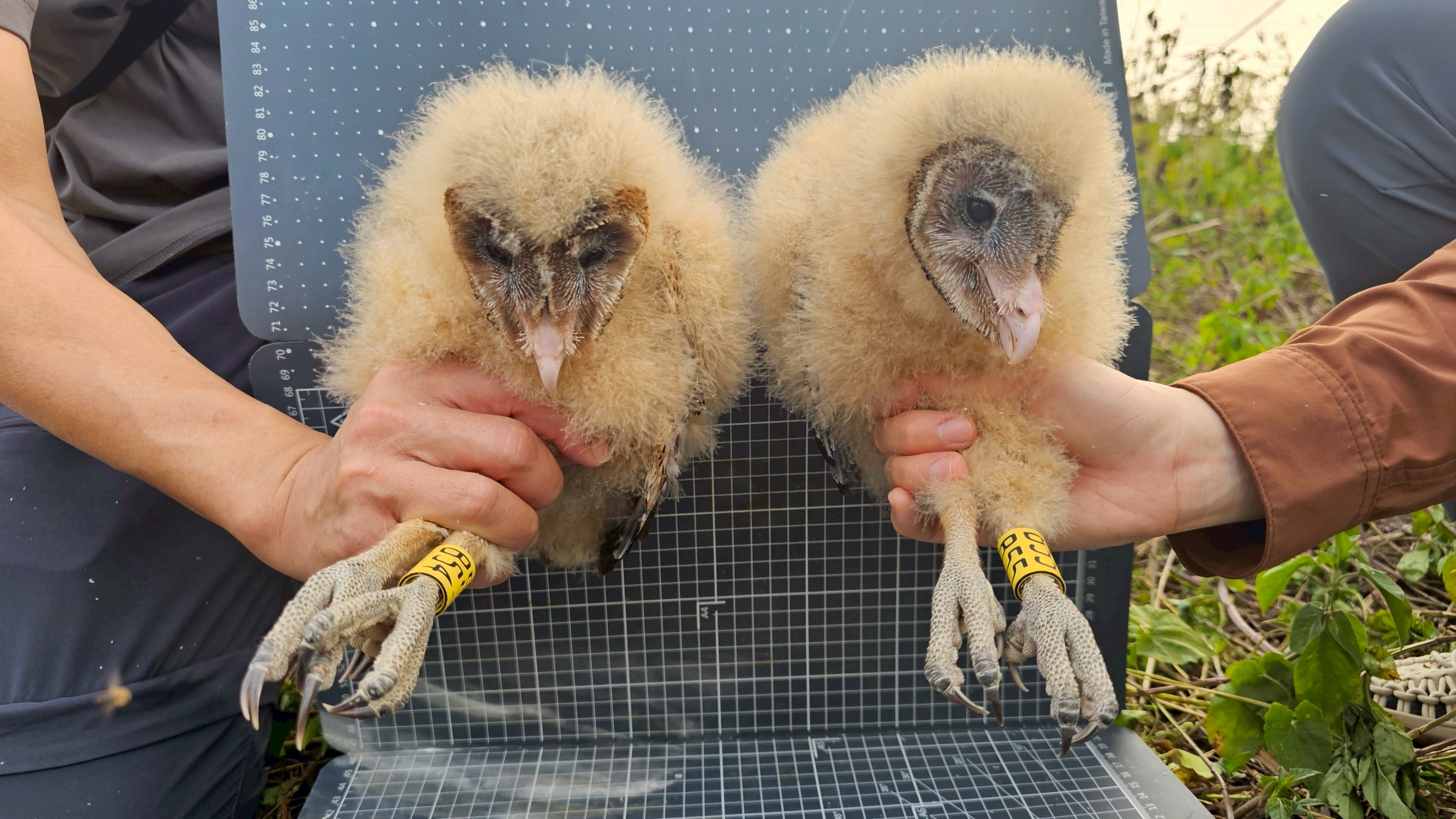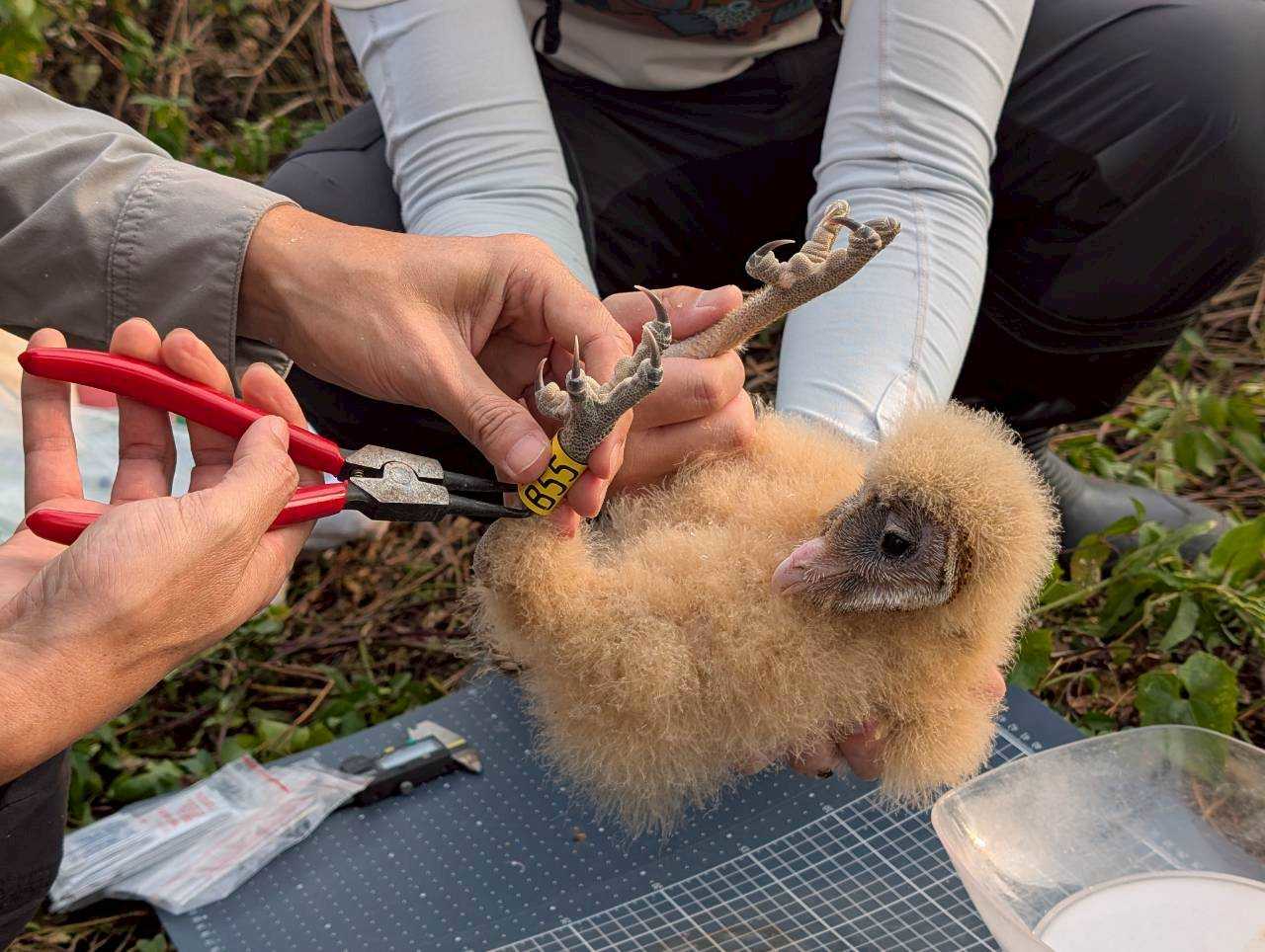 在冬季枯黃的草生地上,身披淺棕色絨毛的草鴞幼鳥完美融入這片地景之中,若非親鳥從草叢中飛起,這神祕的身影極難被察覺。林業及自然保育署屏東分署委託國立屏東科技大學野生動物保育研究所洪孝宇助理教授,執行高屏地區草鴞保育工作,長期追蹤草鴞族群動態。近日在林邊溪流域觀測到珍貴紀錄,一隻身上還有黃褐羽色的草鴞亞成雌鳥,在草生地築巢並成功繁殖育雛。這不僅是目前已知台灣最南端的繁殖觀測案例,更展現了草鴞在棲地選擇與生命週期上的強大適應力。 被稱為「猴面鷹」的草鴞,是臺灣唯一在草地上築巢的貓頭鷹,過去繁殖紀錄多集中在高屏溪流域,然而本次在林邊溪流域發現的巢位並非典型的白茅優勢草地,親鳥在一片以外來種植物香澤蘭為主的草生地中,巧妙利用零星的白茅草叢構築成新生命的搖籃。為了記錄這難得的繁殖過程,研究團隊透過架設4G自動相機進行遠端監測,完整記錄幼鳥成長的珍貴影像,並在幼鳥滿月之際,進行型質測量、健康檢查與上腳環作業。這些工作如同為幼鳥核發「身分證」,讓研究團隊能持續追蹤其離巢後的生存狀況,進而掌握高屏地區草鴞的族群動態。 研究團隊先前在高屏溪流域的監測資料顯示,適合草鴞繁殖的白茅優勢草地極為有限,且大多已經有成鳥佔據,幼鳥離巢後必須離開親鳥的領域,但在現有棲地飽和的情況下,往往只能暫時待在較差的環境,這可能會導致幼鳥的存活率降低。本次在林邊溪流域發現亞成體的草鴞繁殖,雖然擴大了草鴞的已知分布區,但該環境長滿外來種的香澤蘭,巢中也只有兩隻幼鳥,低於平均的3-5隻,顯示可能屬於較差的棲地。 這起非典型繁殖案例的發現,同步印證了現正推動「國土生態保育綠色網絡」的重要性,即使是看似不起眼的草生地,也可能是瀕危物種延續後代的關鍵棲地。林業保育署屏東分署自2022年便開始嘗試進行白茅草地營造試驗,今年將在屏北以外的地區進行,為草鴞創造更多繁殖棲地。由於草鴞生存高度依賴淺山與農耕環境,屏東分署亦將推動擴大「瀕危物種生態服務給付計畫」範圍,將新埤、枋寮等納入守護版圖。 林保署屏東分署表示,農友若能在農作期間落實不使用除草劑、毒鼠藥,並確保不餵養遊蕩犬貓,每公頃每年最高可領取2萬元獎勵金;歡迎2月3日(周二)及2月4日(周三),在新埤、枋寮有興趣的農友,點擊報名連結(https://forms.gle/fcgJXvukzcBD4xLt7)參加說明會了解詳情。同時,鼓勵農友參與計畫,配合設置猛禽棲架,除能領取維護獎勵,還可能邀請到草鴞進駐農田出工捕鼠,成為守護作物的天然盟友。最後,林保署屏東分署呼籲,透過生態服務給付的實質支持,共同為這群神祕的暗夜守護者營造永續生存的家園。