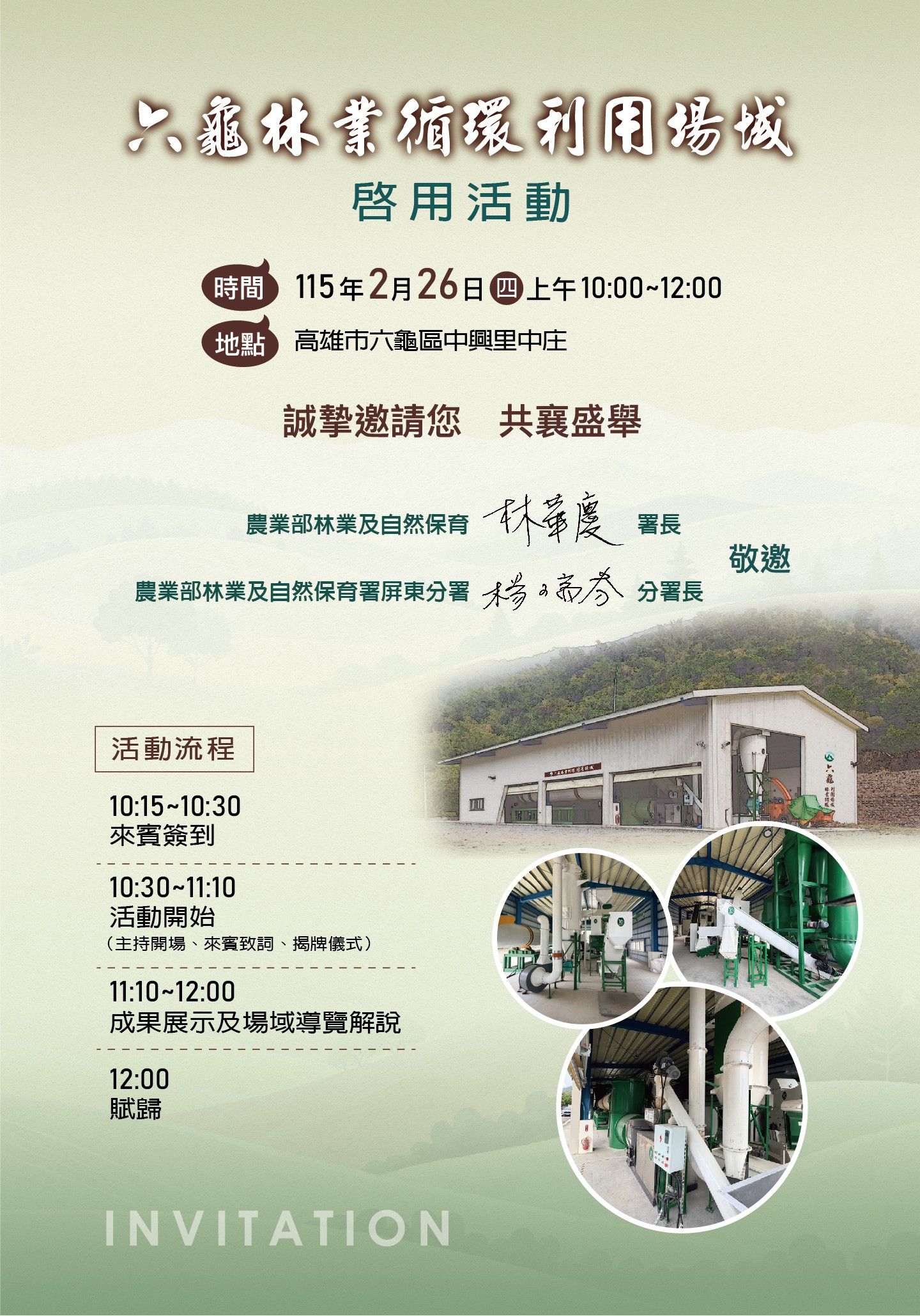 農業部林業及自然保育署為推動「永續林業.生態臺灣」及回應全球氣候變遷挑戰,將於2月26日(四)假高雄六龜苗圃,舉辦「六龜林業循環利用場域」盛大揭牌啟用典禮。此場域為屏東分署轄區內首座整合林業剩餘資材從收集、處理到加值利用的示範據點,誠摯邀請關心永續發展的各界人士蒞臨採訪、共襄盛舉。 活動重點與特色: 循環經濟實踐: 場域設置先進的木竹生質顆粒造粒系統,預計將荖濃溪及旗山事業區每年約660噸的疏伐資材,轉化為生質顆粒,落實資源全循環。 回應淨零目標:響應國家2050淨零排放路徑,透過林業剩餘資材的有效利用與產品開發,提升森林碳匯效益,為減緩氣候變遷做出具體貢獻。 成果展示導覽:現場將進行場域導覽及多元產品成果展示,深入了解林業剩餘資材如何「點材成金」。 屏東分署楊分署長表示:「本場域的啟用,象徵著台灣林業從傳統生產邁向循環永續的關鍵轉捩點。我們期待透過公私協力模式,打造一個生產、生活、生態『三生合一』的示範場域,歡迎大家一同前來見證這歷史性的一刻。」